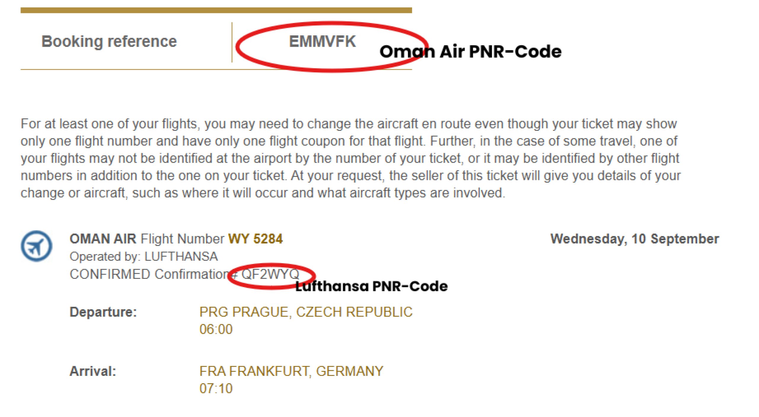 Alla flyg köptes som en bokning, men Lufthansas flyg från Prag till Frankfurt hade en annan PNR-kod än Oman Airs flyg från Frankfurt FRA via Muscat MCT till Zanzibar ZNZ.