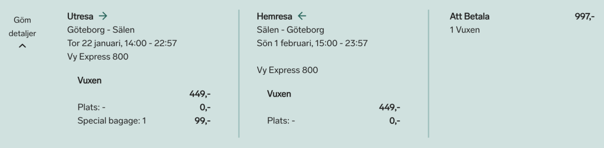Enkelbiljetter kostar 449 kr och kan köpas direkt på hemsidan bus4you.se. I priset ingår handbagage och en resväska på 25 kg. Att transportera en skidväska kostar 99 kr.