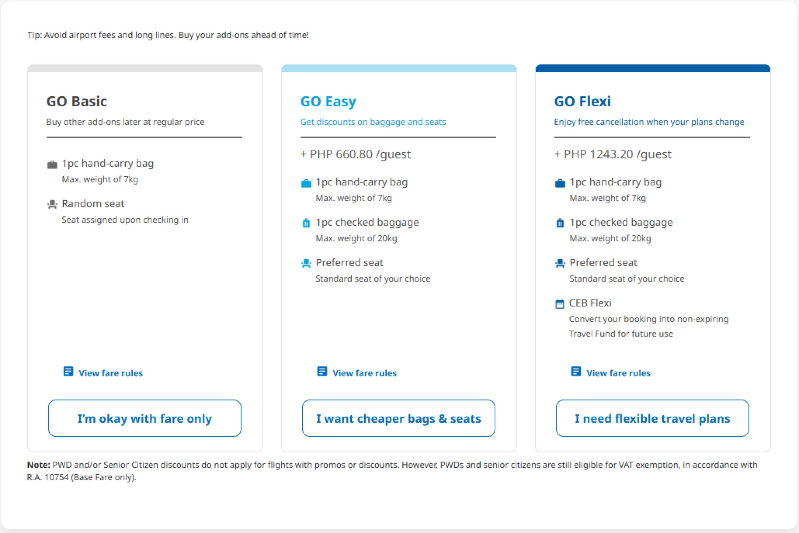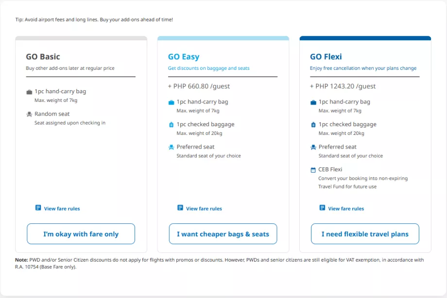 - GO Flexi - Gratis incheckat bagage (20 kg) och handbagage, gratis platsval, gratis avbokning (pengarna återbetalas som ett tillgodohavande för framtida användning med Cebu Pacific)