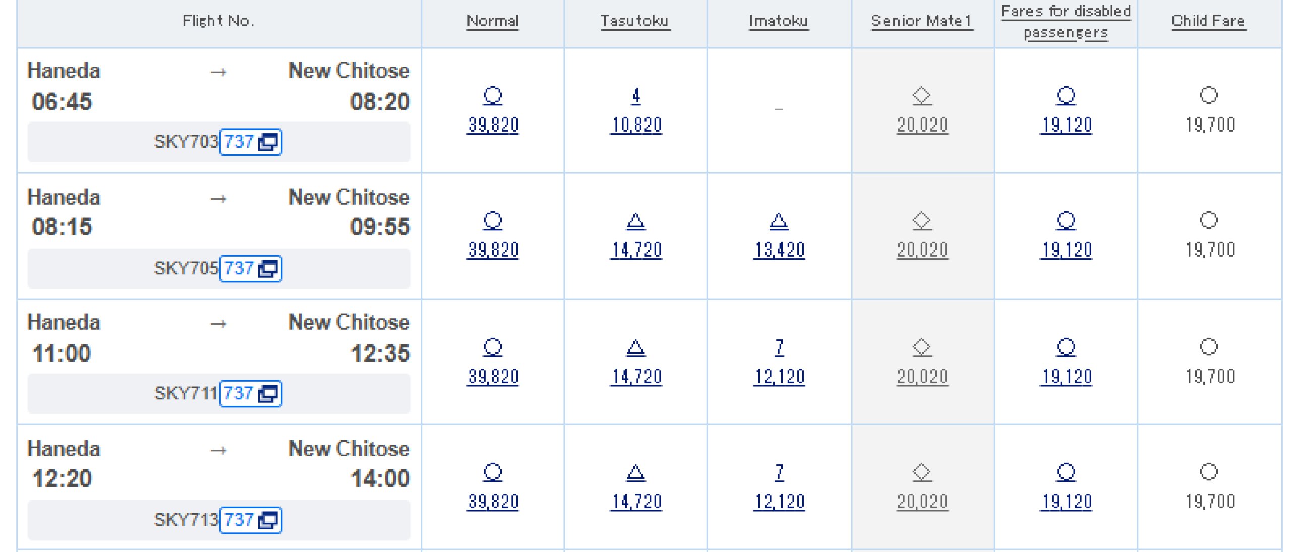 Flygbiljetter säljs normalt på den officiella hemsidan skymark.co.jp.