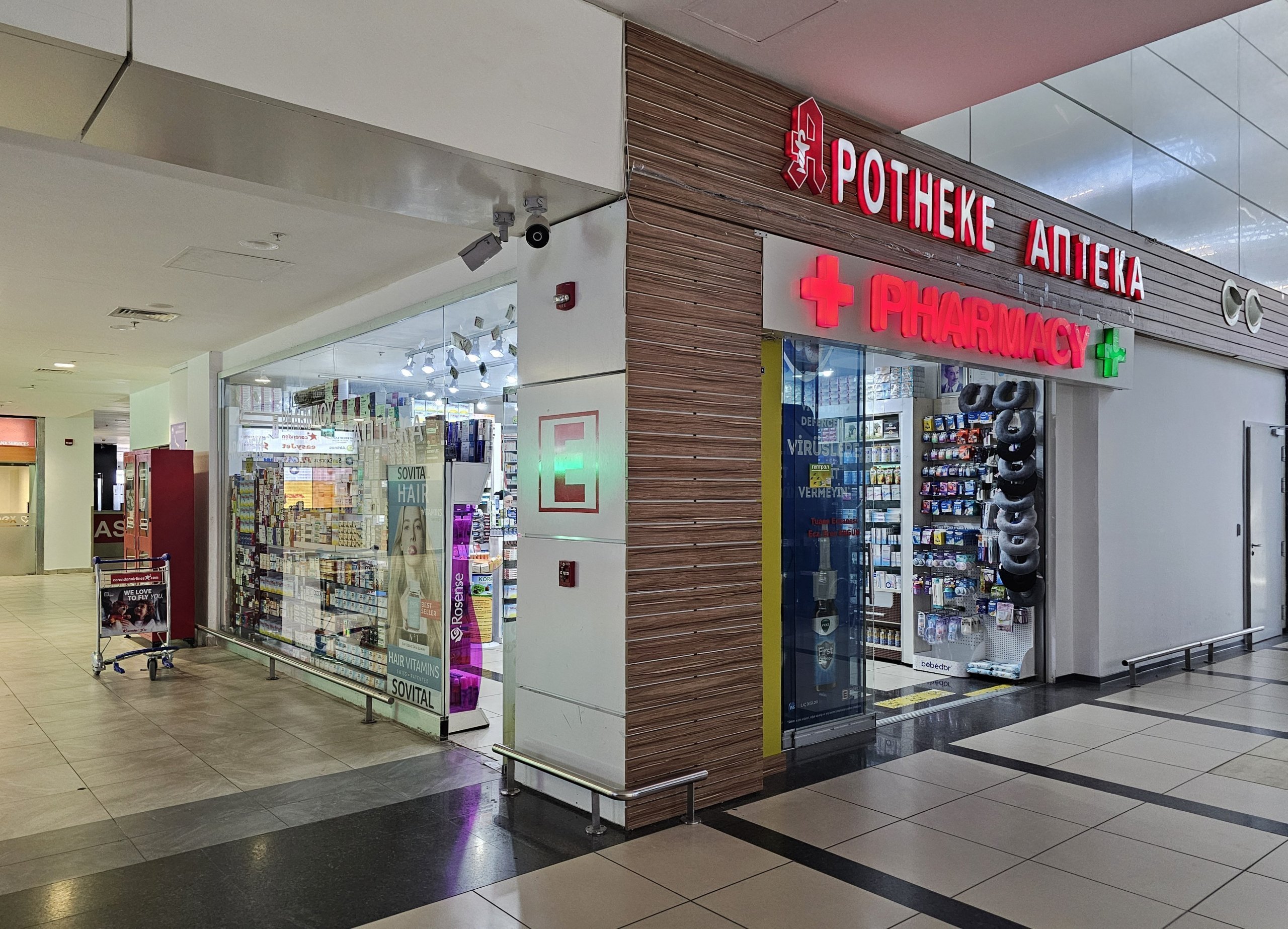 Apotek finns i de allmänna utrymmena i båda terminalerna (öppet 24/7 i Terminal 1, öppet 9:00-18:00 i Terminal 2).