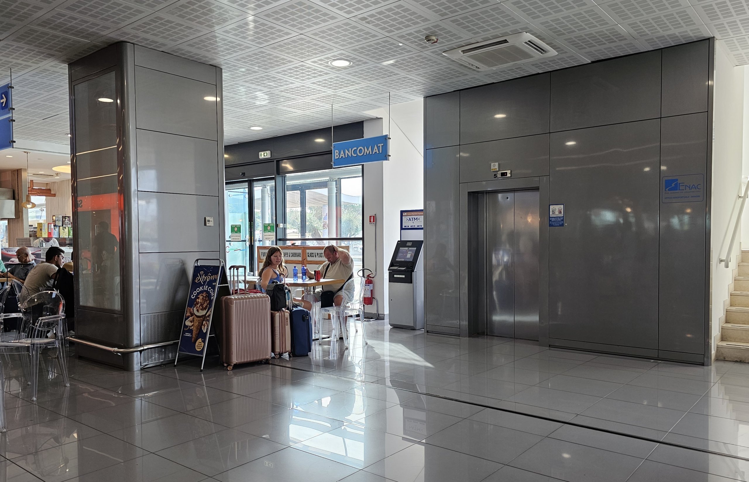 Uttagsautomaten vid bagagebanden drivs av Euronet och har en uttagsavgift på ca 5 euro och en ofördelaktig växelkurs. Vi rekommenderar att du går ut i lobbyn mellan ankomst och avgång för att ta ut pengar från Banca Popolare Puglieses uttagsautomat utan avgift.