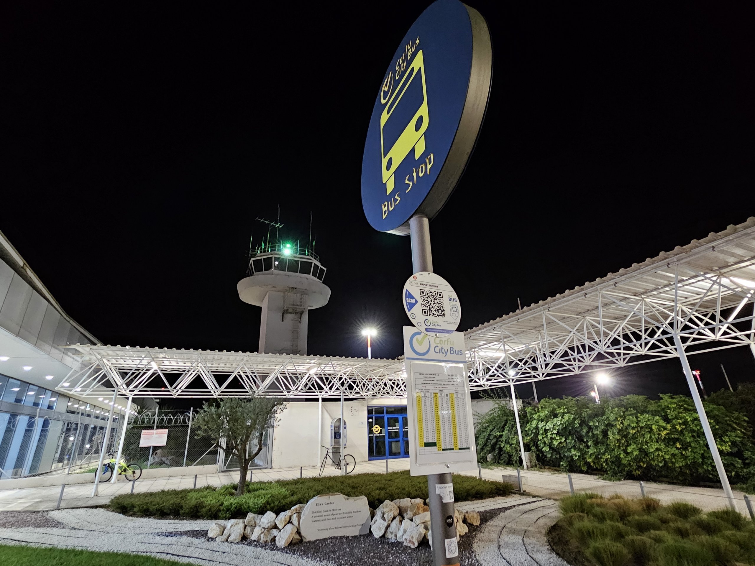 Busshållplatsen ligger till vänster om ankomsthallen nära flygplatsens kontrolltorn. Busshållplatsen är markerad med en skylt med texten "Bus stop" och en tidtabell.