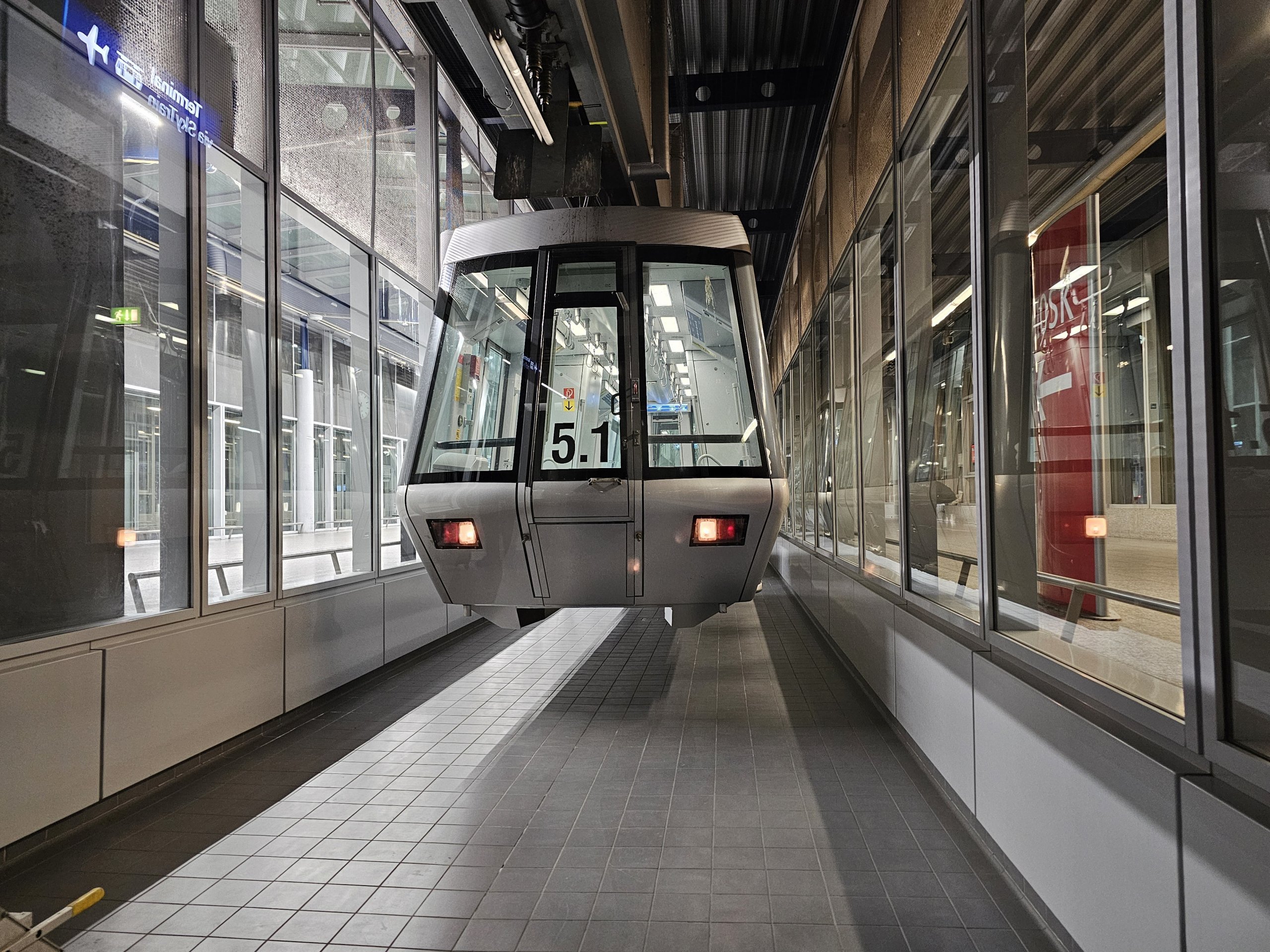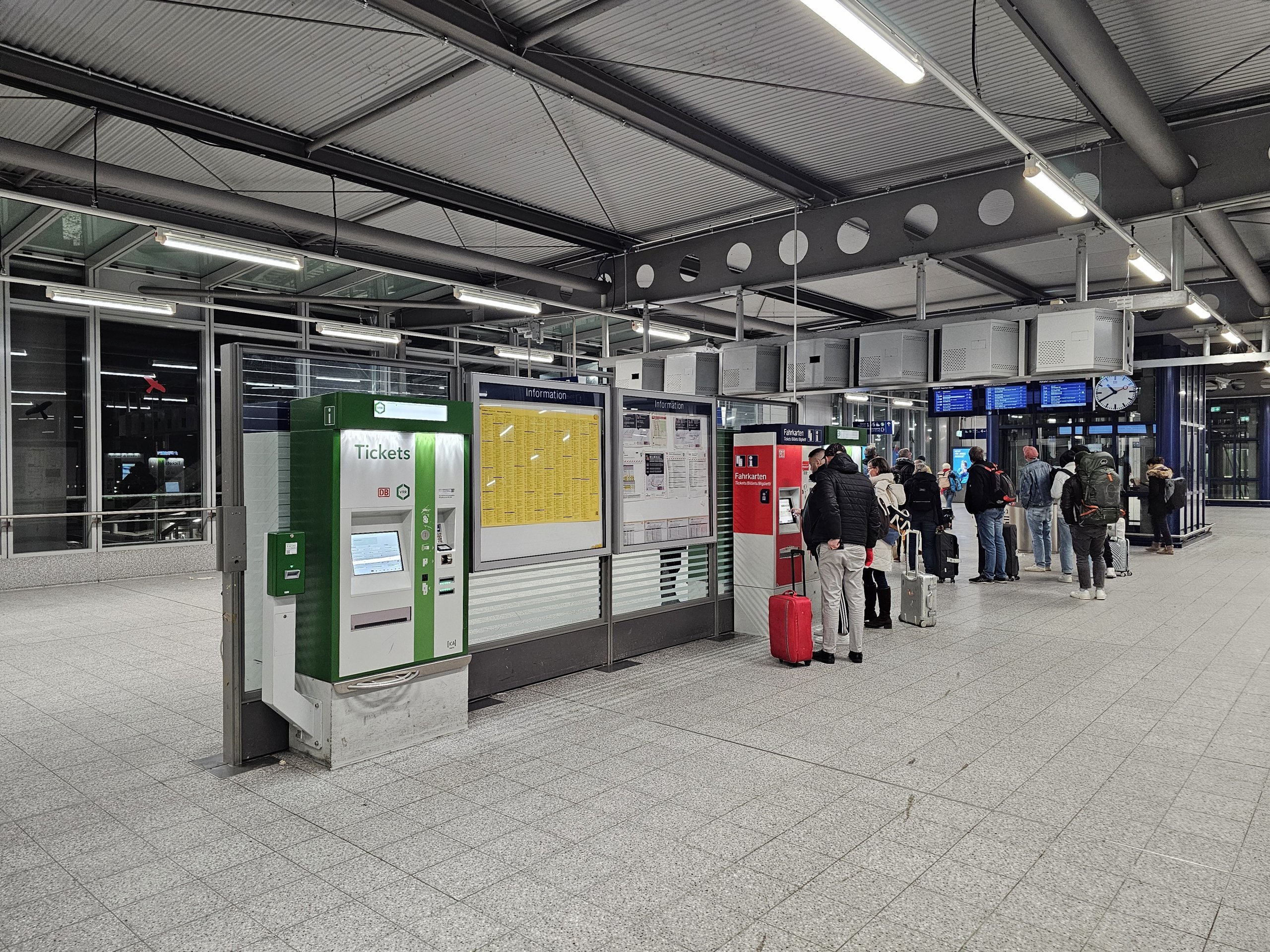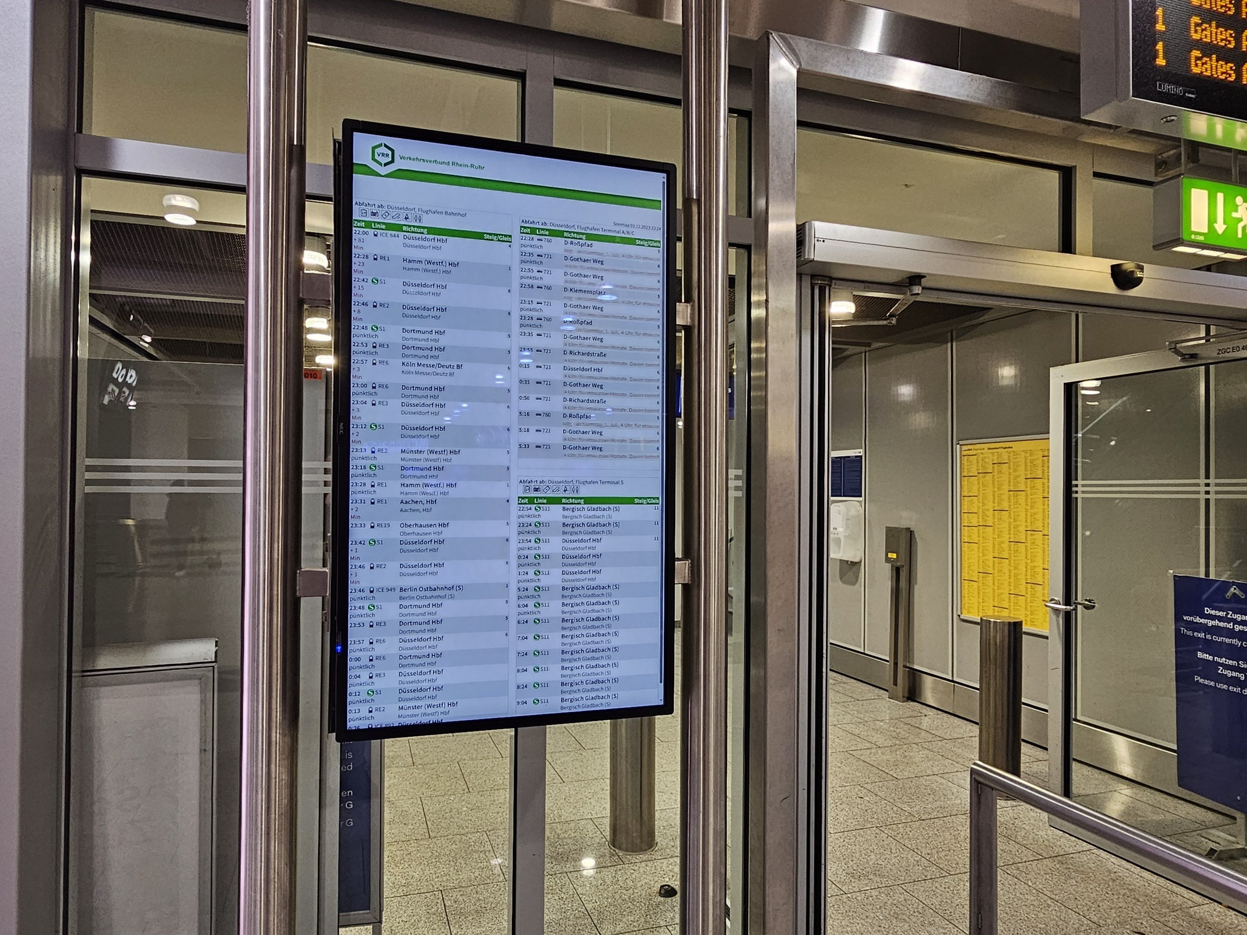 Innan du lämnar flygplatsterminalen kan du jämföra de aktuella avgångarna för alla tjänster på den interaktiva avgångstavlan och jämföra om det är värt att ta det automatiska tåget till tågstationen eller om du hellre vill använda S-Bahn S11 direkt från terminalen.