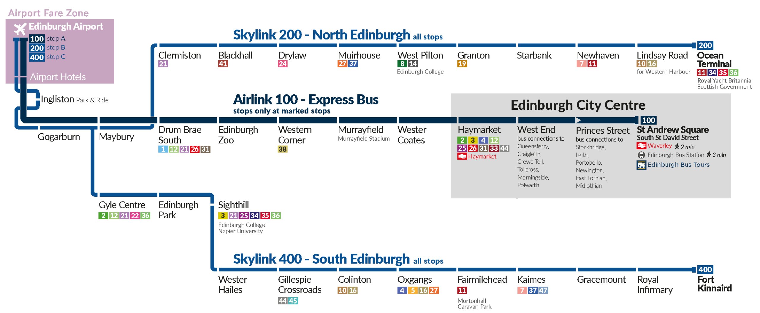 Edinburgh trafikeras av tre busslinjer och en spårvagn. Den billigaste transporten är bussarna för 6 gbp, den snabbare spårvagnen för 7,90 gbp.