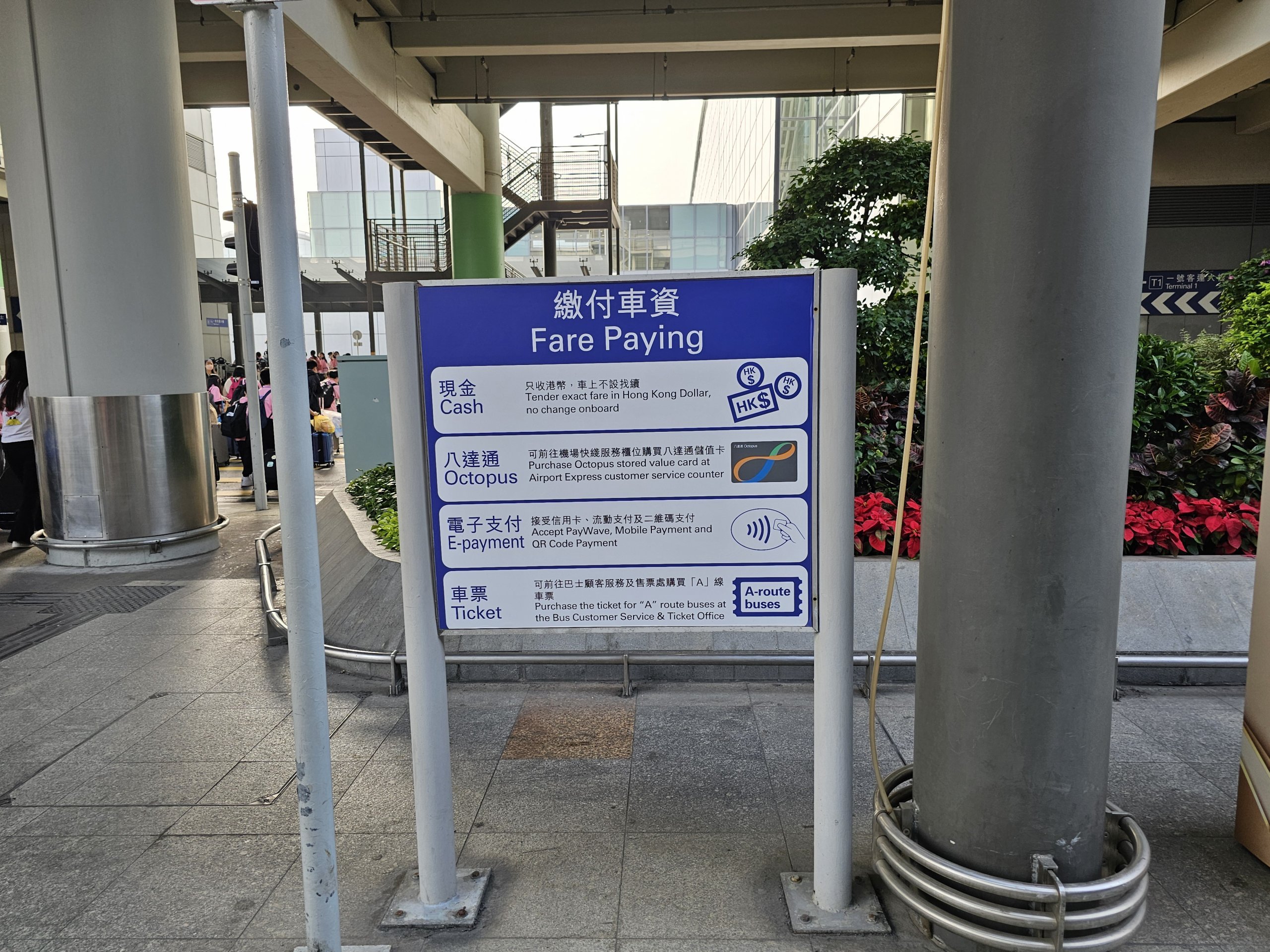 Den totala restiden från flygplatsen till Hong Kong Station är cirka 50 till 55 minuter med hänsyn tagen till buss, tunnelbana och transfer. Bytet vid Tung Chung Station är mycket enkelt. Busstationen ligger på bottenvåningen i köpcentret och S1-busshållplatsen är den första precis vid ingången till stationen.