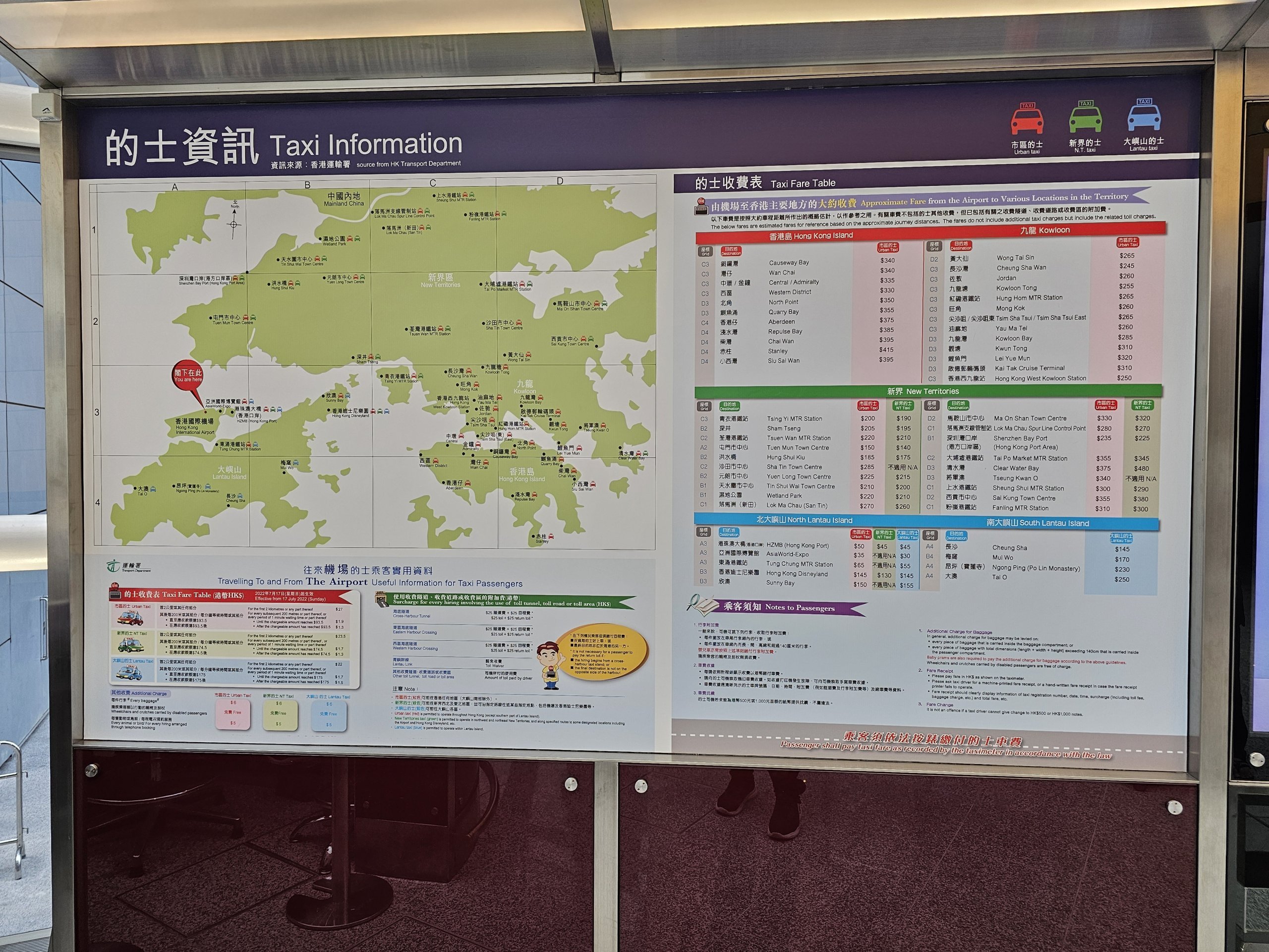 Taxibilar kan endast betalas med kontanter, inga kreditkort eller Octopus-kort kan användas för betalning.