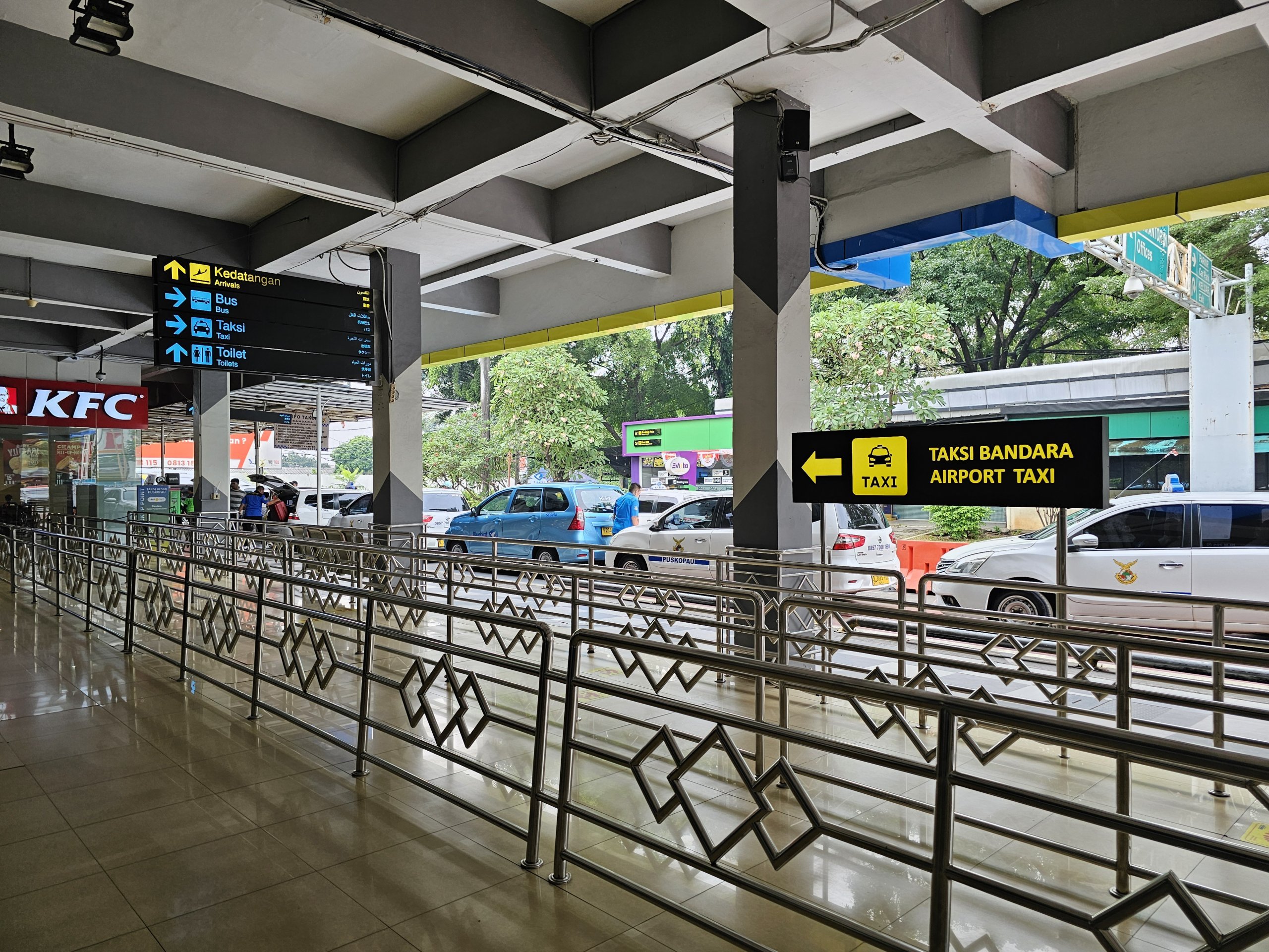 Direkt utanför ankomsthallen ligger hållplatsen för skyttelbussen, som tar dig till stationen för expressbussen som går till Bandung.