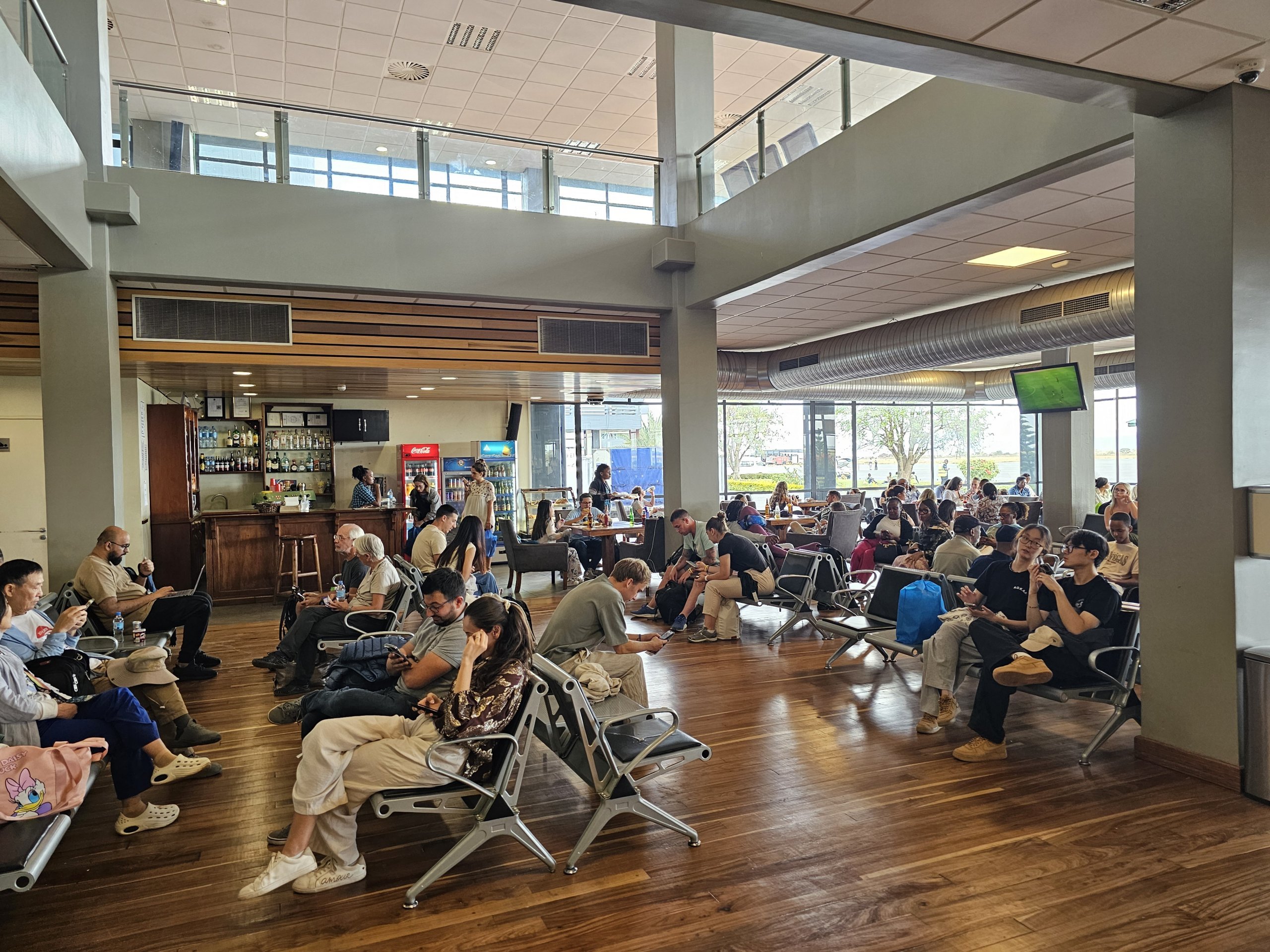 Nackdelen är att det är mycket trångt om ett större plan håller på att checka in på en internationell flygning, och det är brist på sittplatser. Procedurerna före avgång är dock relativt snabba och du behöver bara anlända 2 timmar före avgång.