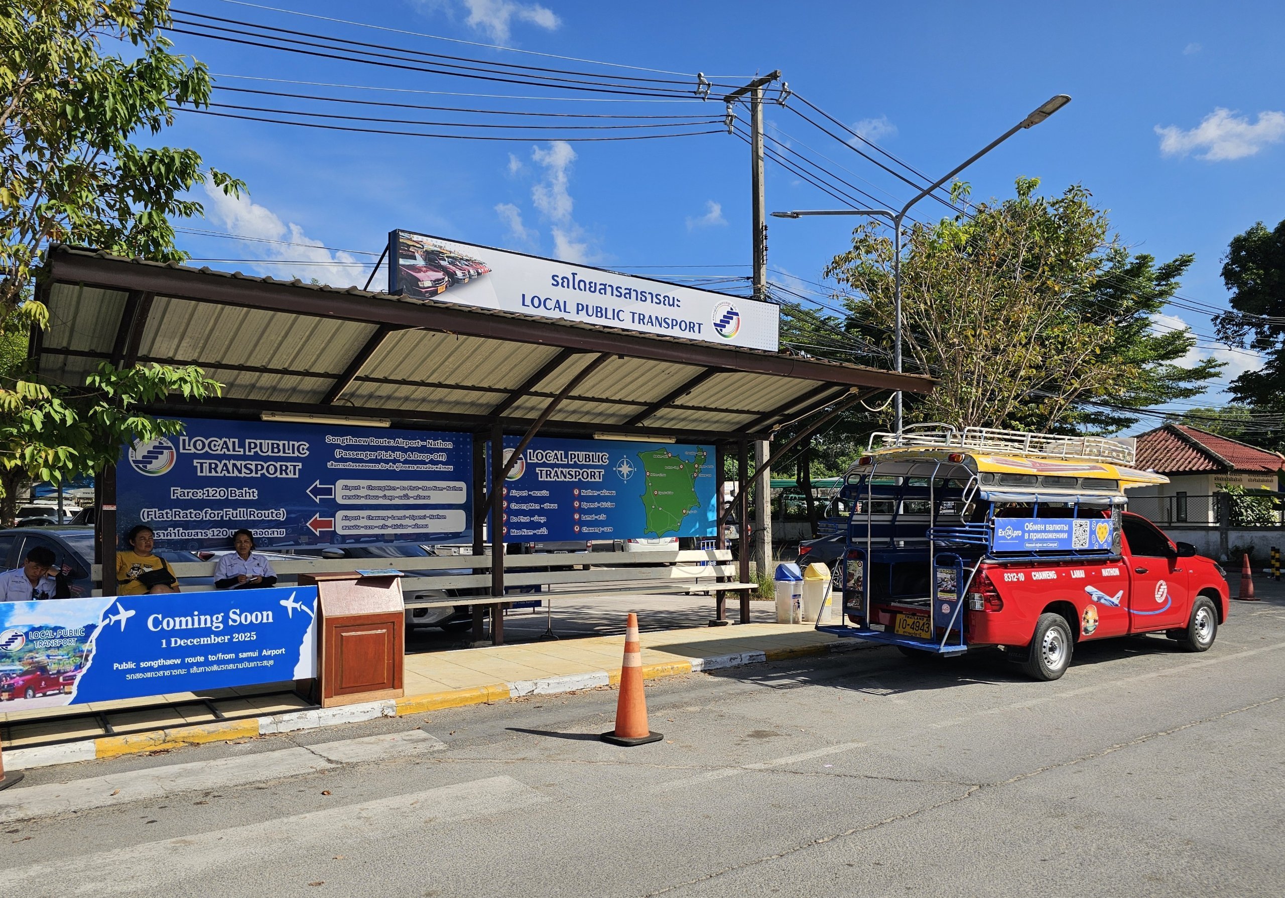 Det finns praktiskt taget ingen konventionell kollektivtrafik på ön, men det enda undantaget är den officiella flygplatsrutten med öppna pickuper - som kallas songthaew på thailändska.