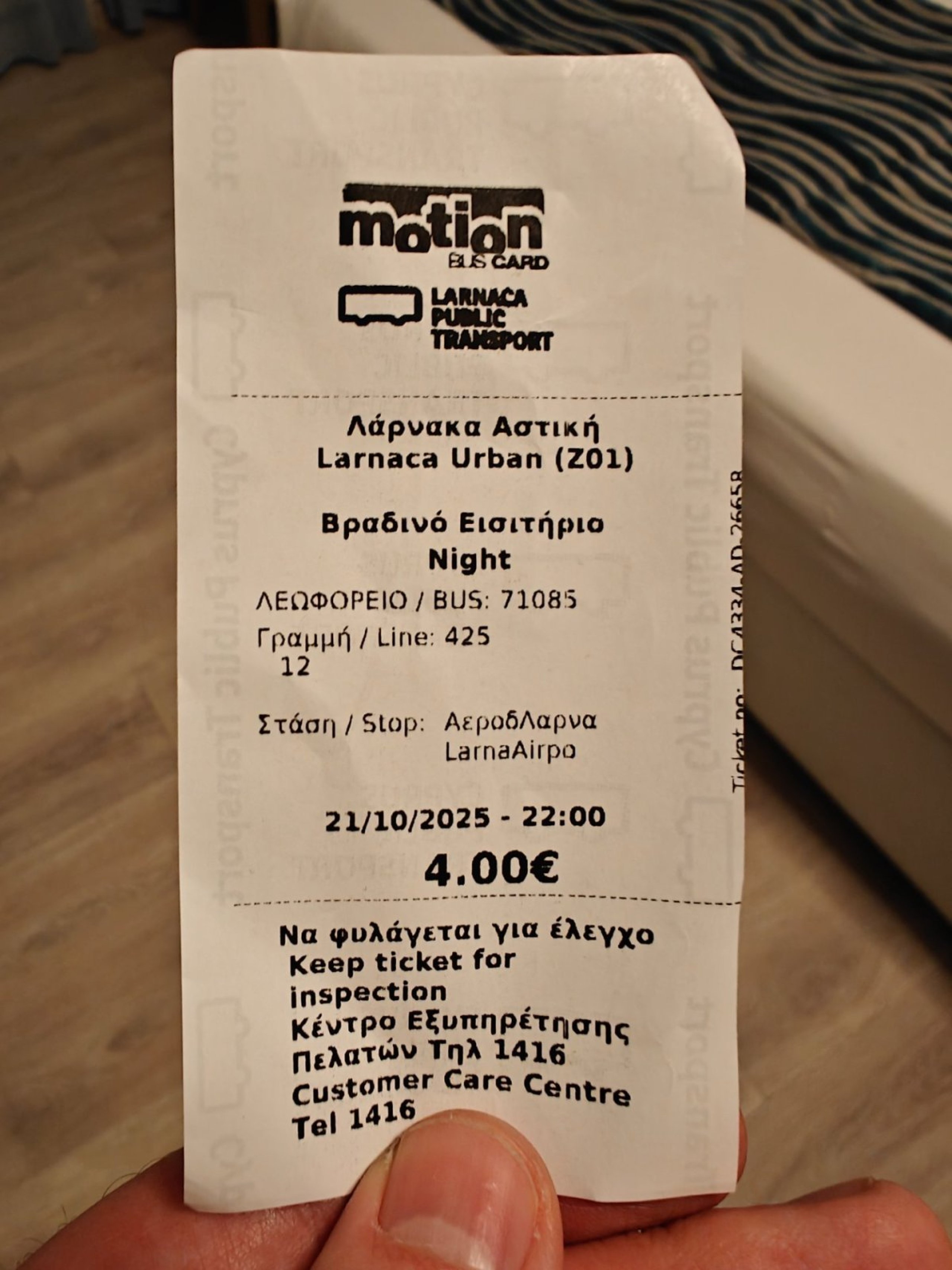 - 2,40 eur - 1 resa var som helst med kollektivtrafiken i Larnaca (ej överförbar biljett)
