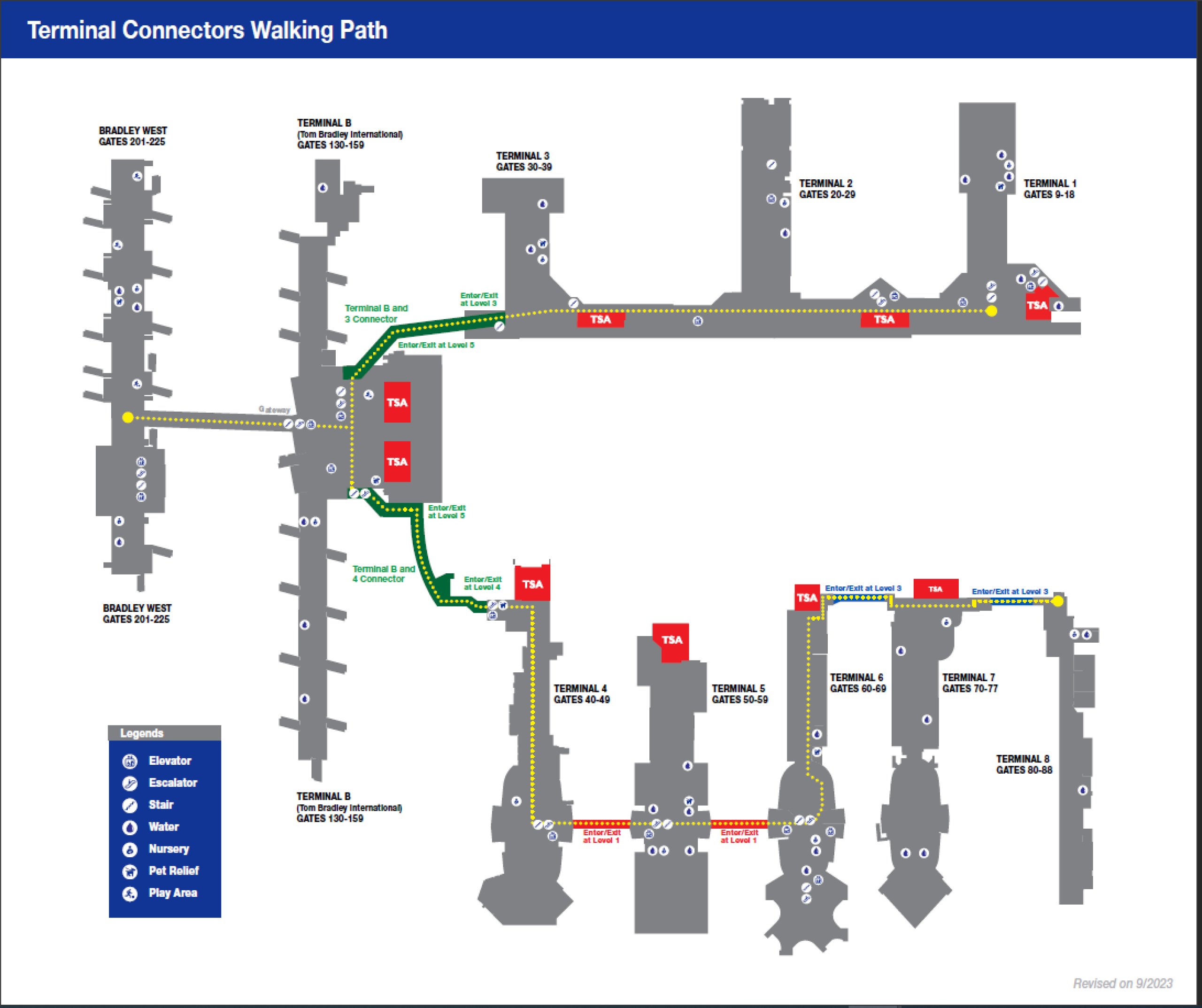 Om du anländer till Los Angeles med ett internationellt flyg kommer du alltid att anlända till terminal B (TBIT). Du måste lämna transitområdet, gå igenom immigrationen och röra dig genom det yttre området mellan terminalerna. Du checkar in igen och går genom säkerhetskontrollen in i transitområdet.