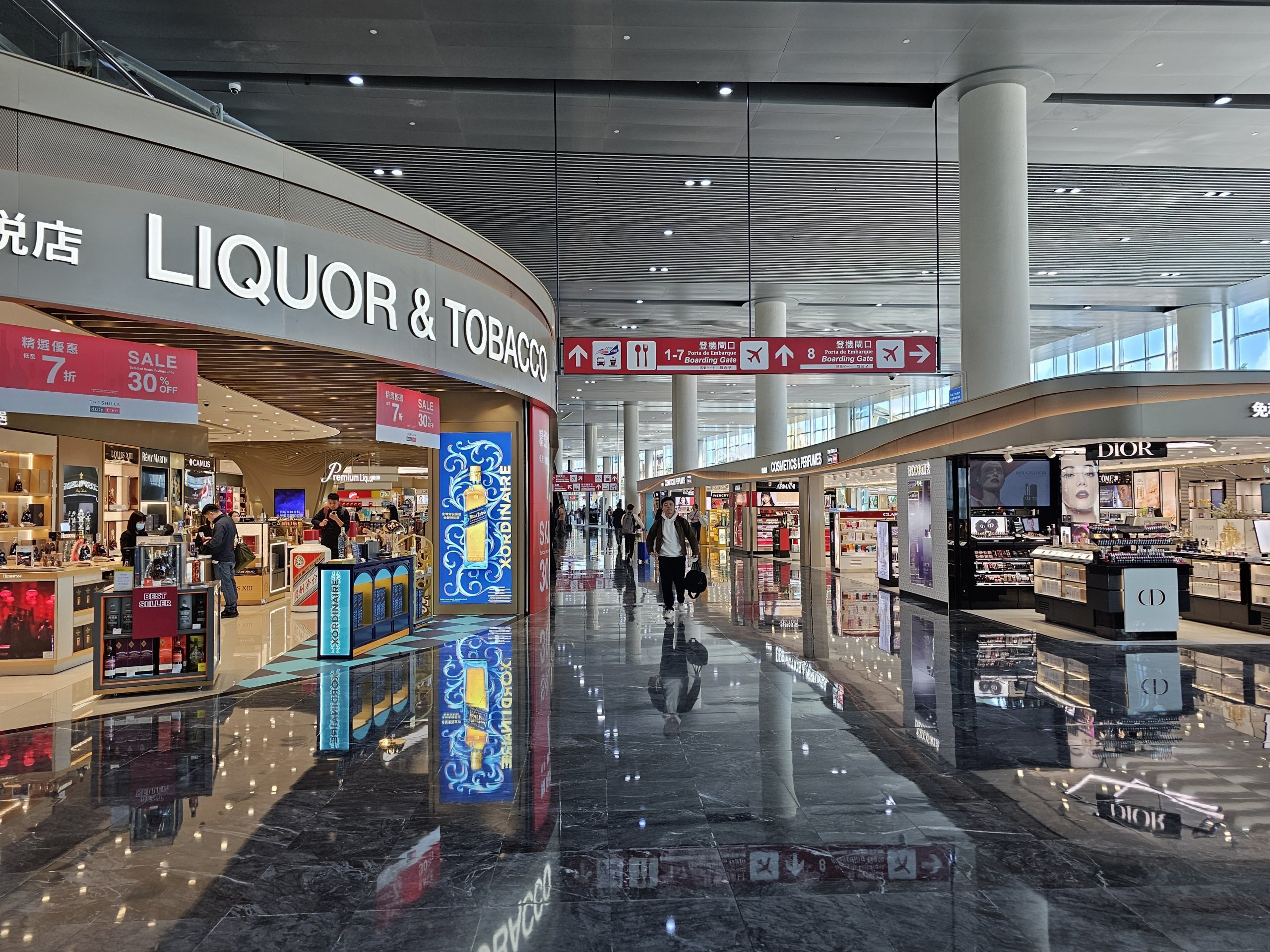 Efter säkerhetskontrollen befinner du dig i en korridor med butiker som säljer lyxmode, smycken och duty free varor.