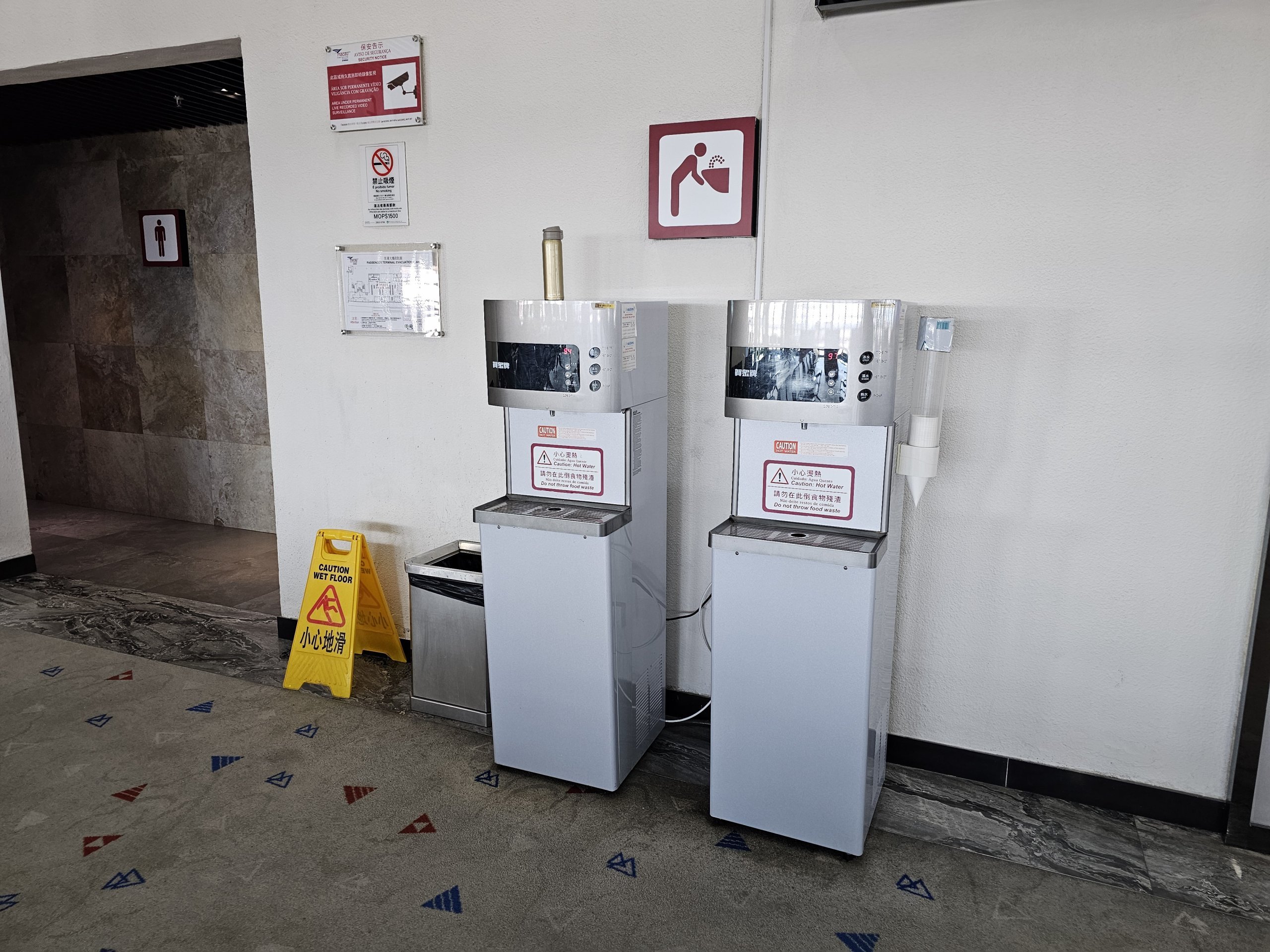 Automater för kallt, ljummet och varmt dricksvatten finns alltid på hela flygplatsen i närheten av toaletterna. Du kan fylla din egen flaska gratis.