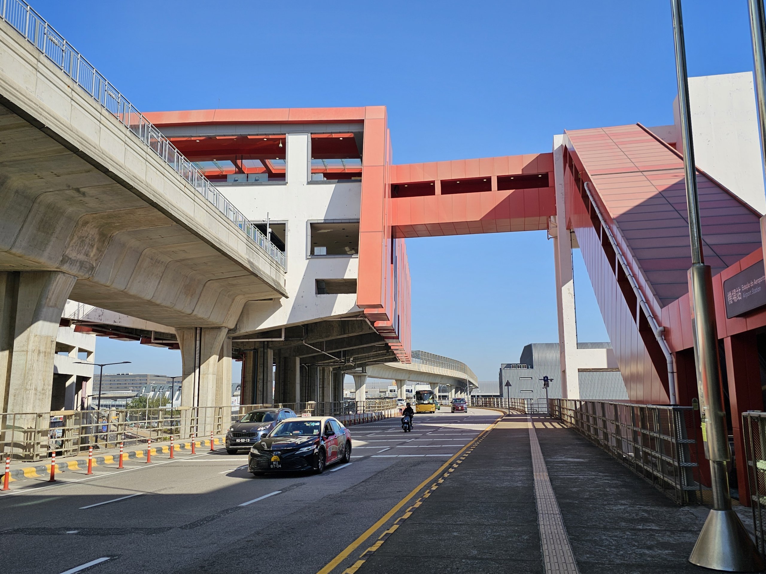 Till höger om terminalen finns hållplatserna för de kostnadsfria hotellbussarna som går med jämna mellanrum från flygplatsen till Macaus stora hotell.