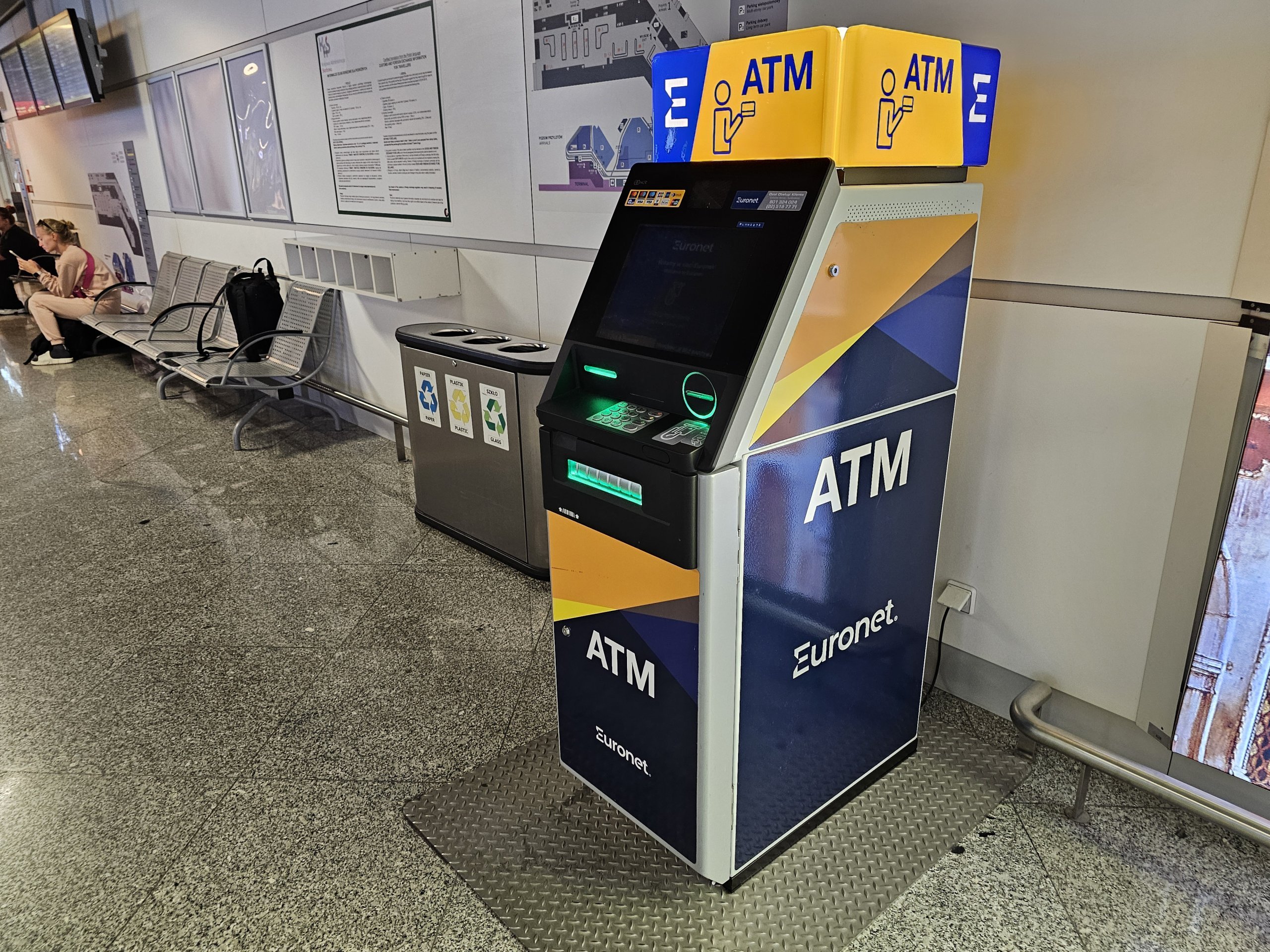 Endast Euronet har uttagsautomater på flygplatsen, med höga uttagsavgifter och mycket ofördelaktiga växelkurser.