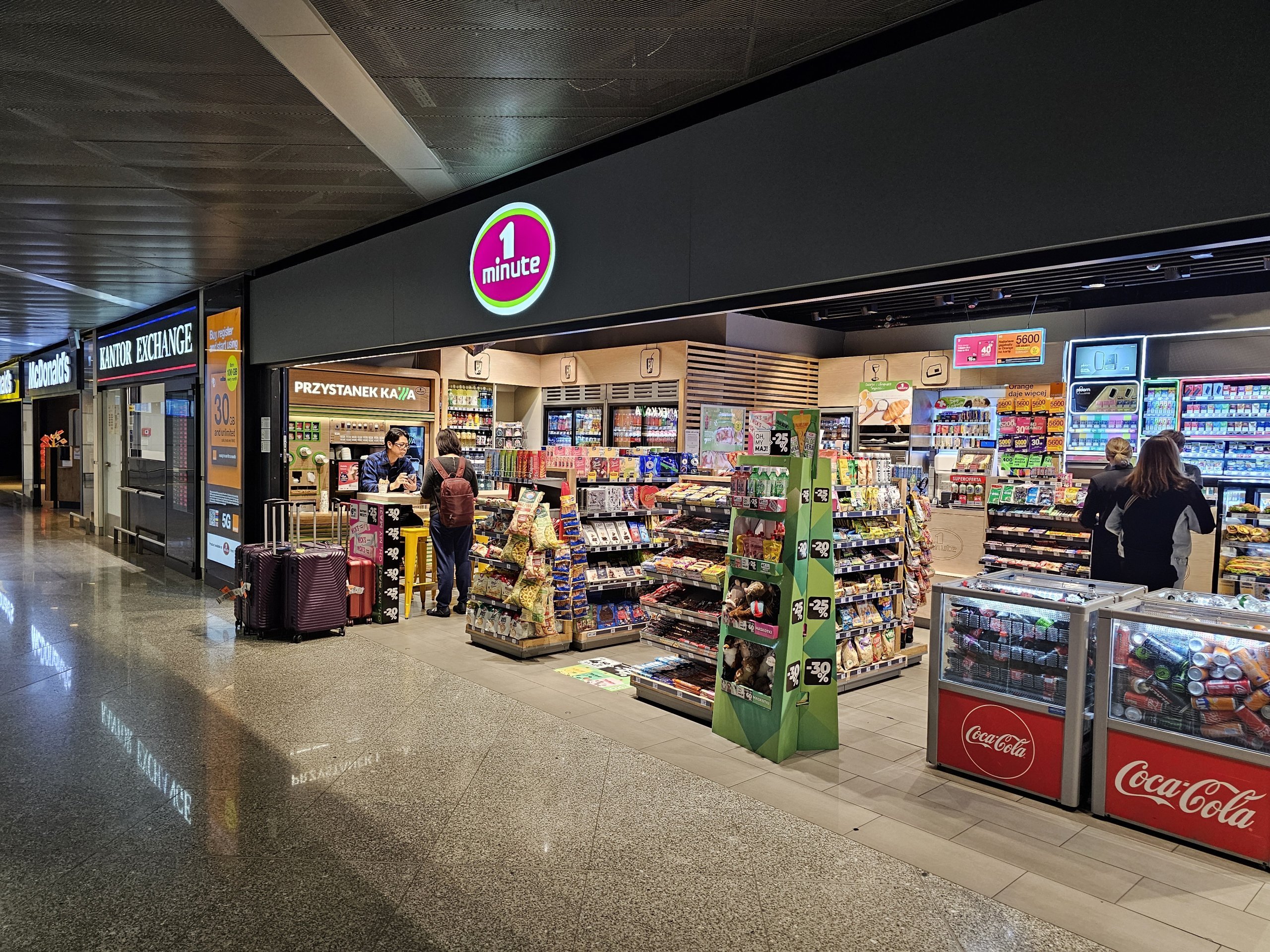 Livsmedelsbutiker brukar vara de mest populära på flygplatser. I Warszawa hittar du dem i form av minimarknader:
