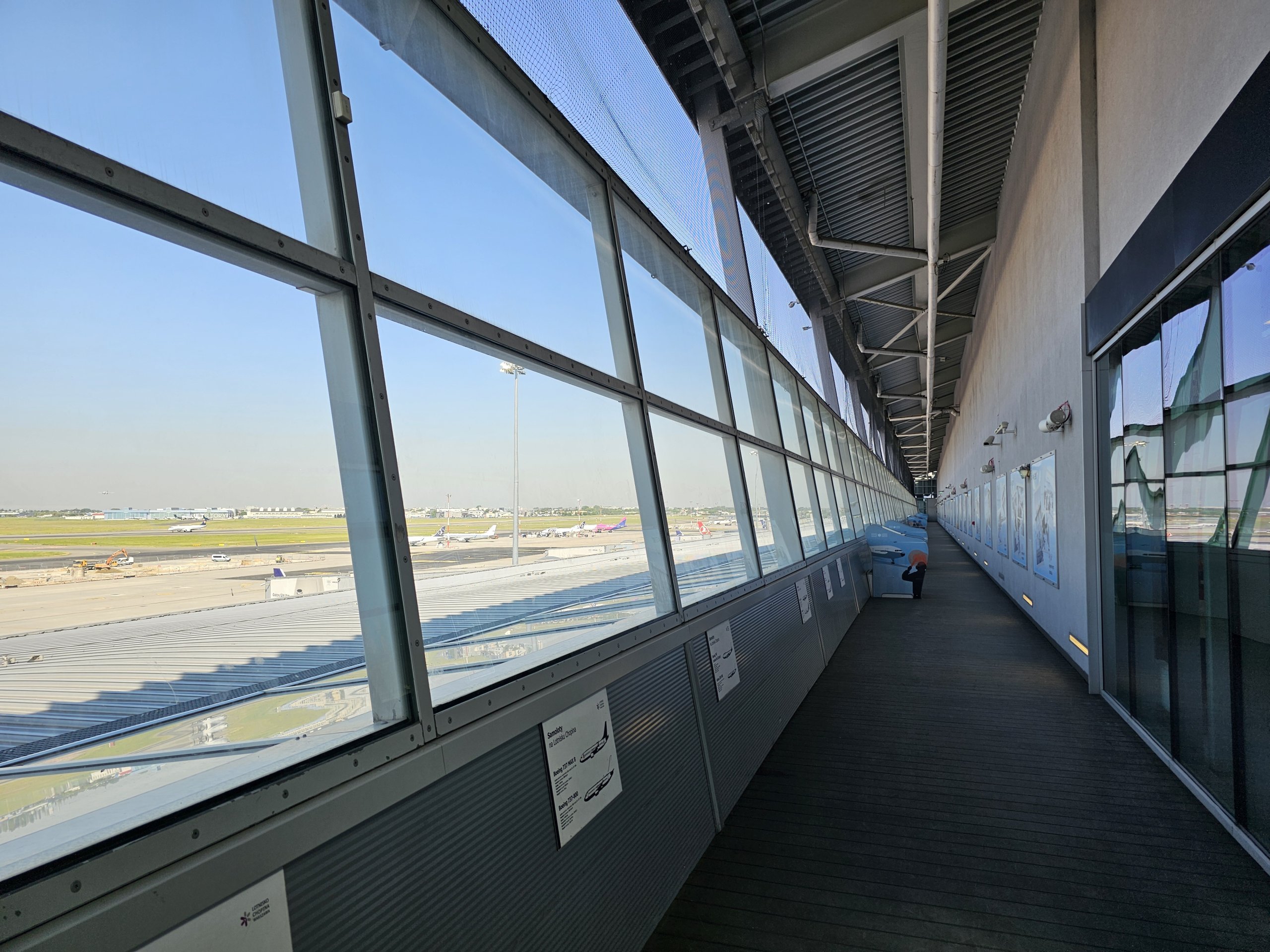 Ta dig tid före flygningen att besöka det täckta observationsdäcket, där du kan se asfalten och landningsbanan.
