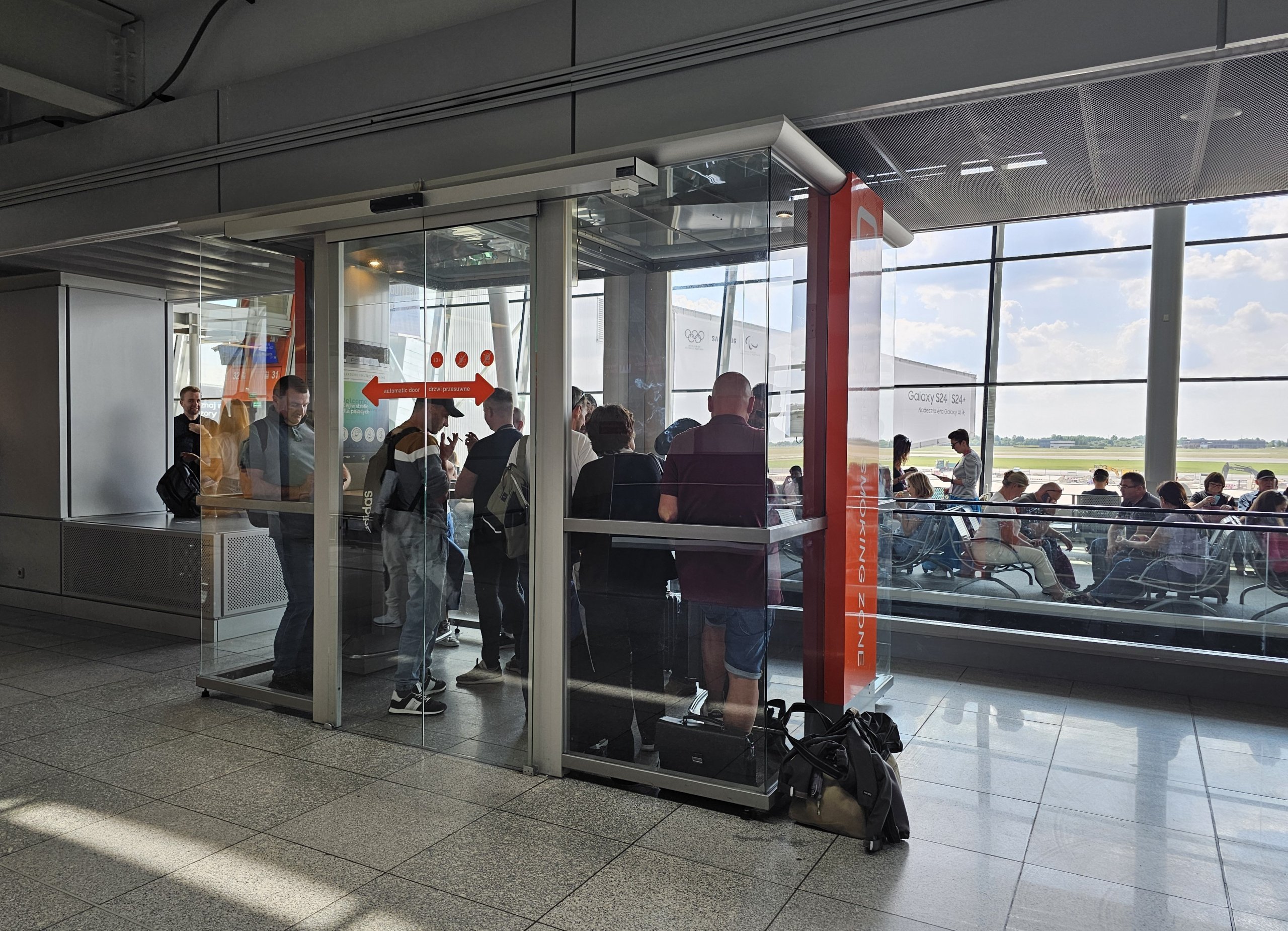 På flera ställen kan rökare, efter säkerhetskontrollen, använda mycket små ventilerade bås.