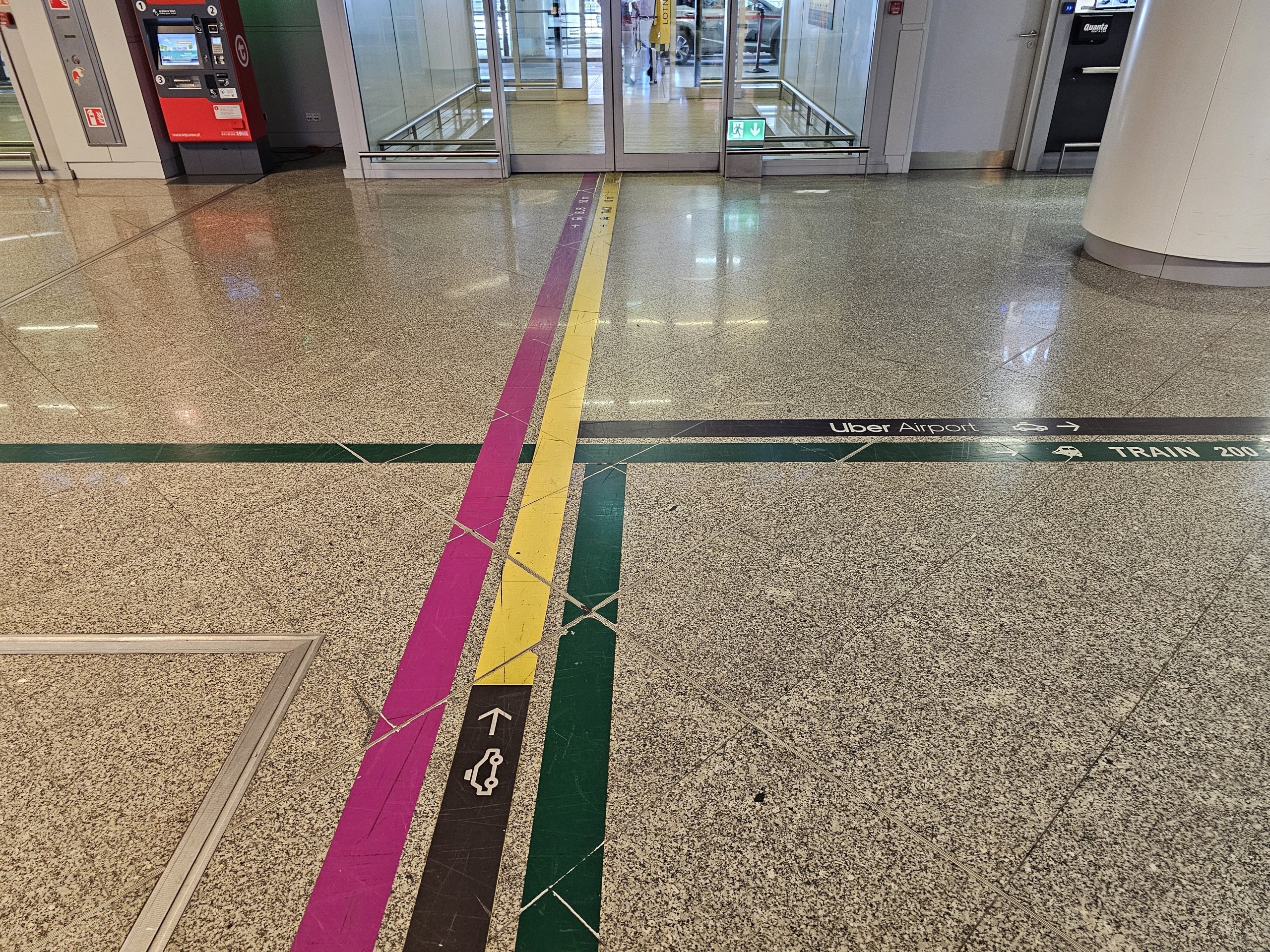 När du har lämnat transitzonen kommer tydliga färgkodade skyltar på golvet att vägleda dig till varje transportsätt. Följ dessa färger för varje transportmedel: