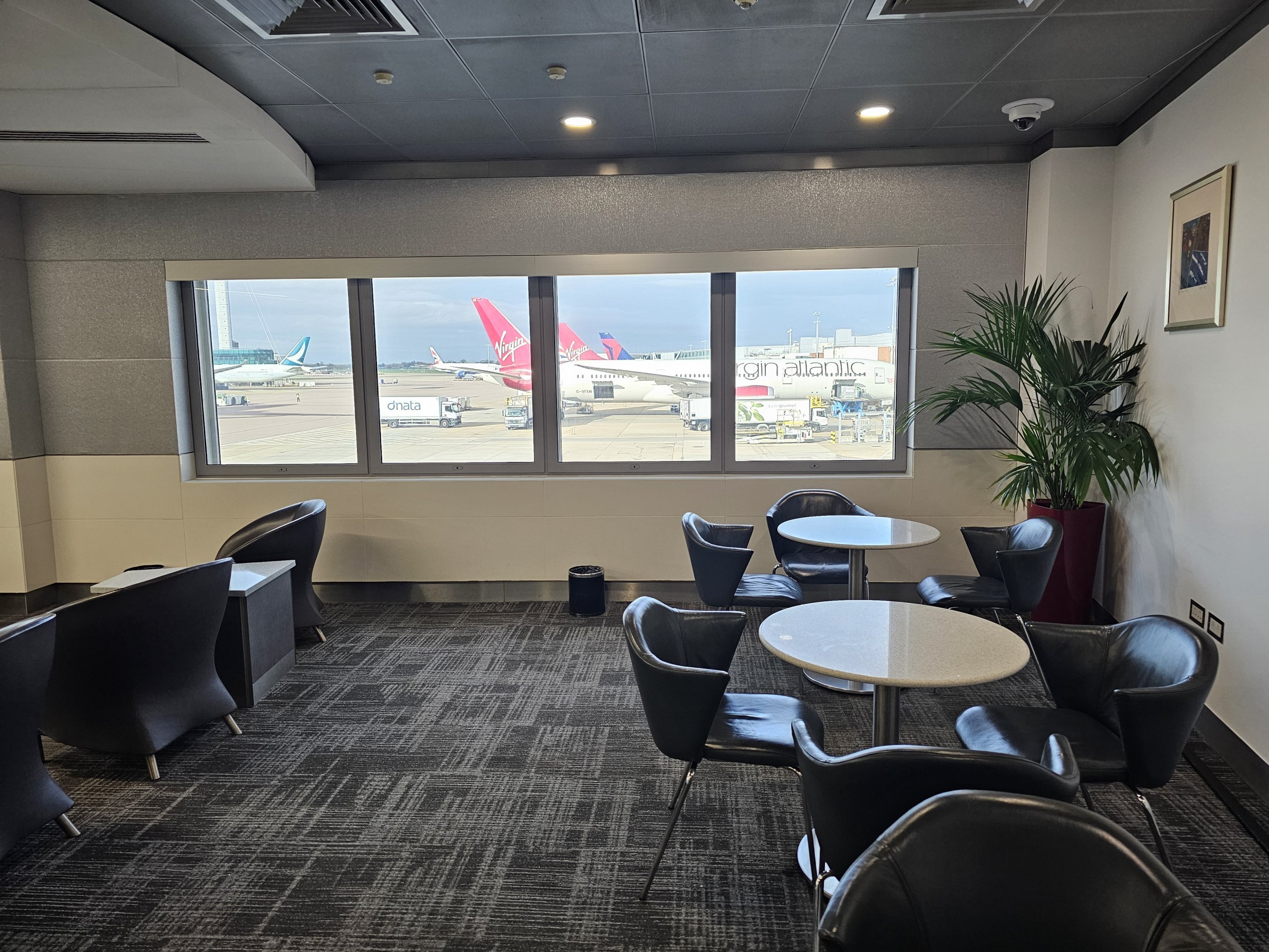 En stor fördel är den fantastiska utsikten över flygplatsens asfalt - det finns uppställningsplatser för stora långdistansflygplan direkt framför loungen, och du kan också se det ikoniska Heahtrow Airport-tornet härifrån.