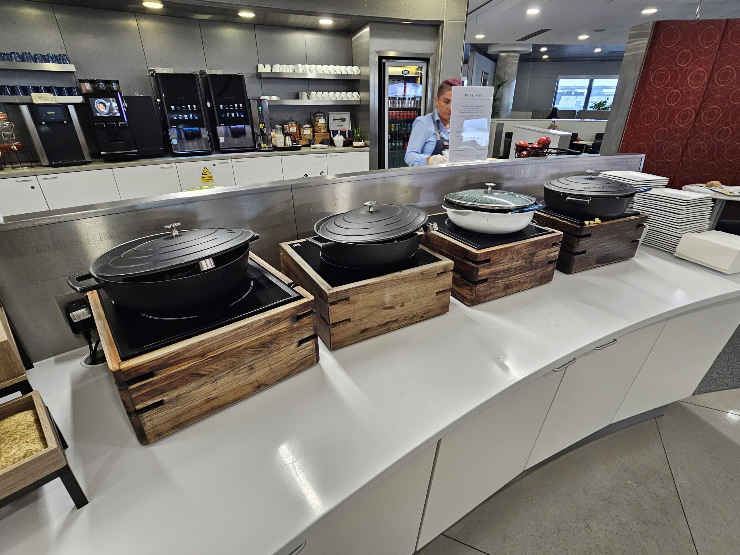 Den varma maten har en frukostmeny (fram till ca kl. 11.30) och en lunchmeny (fram till loungen stänger). Soppa finns tillgänglig under hela dagen.