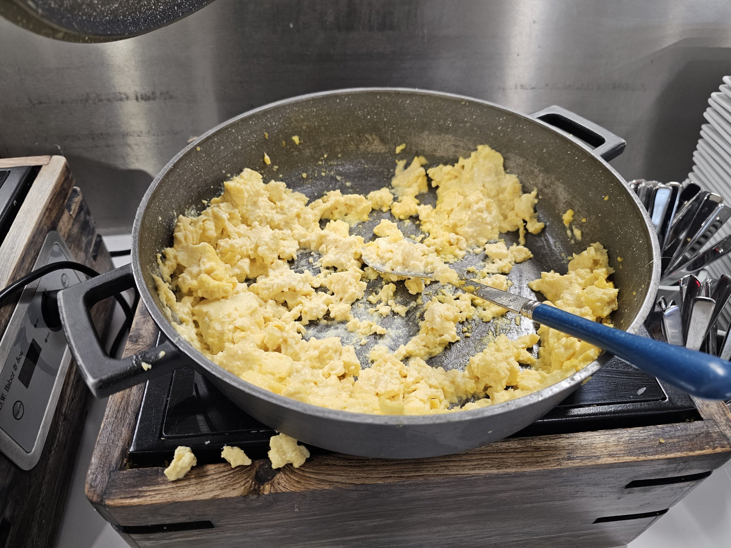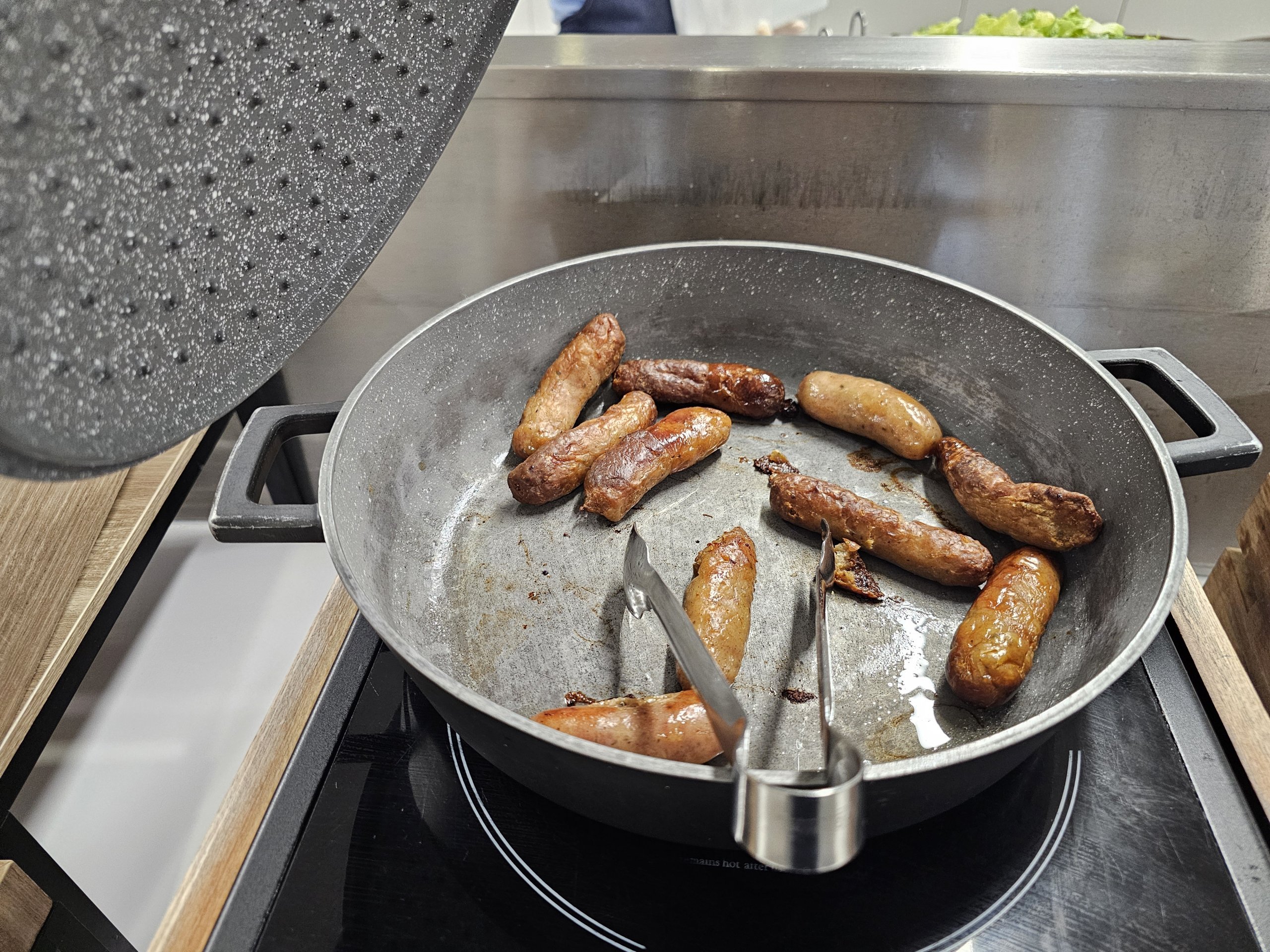 På frukosten finns den klassiska trion äggröra, bacon och korv. Dessutom finns det vanligtvis bönor eller tomater.