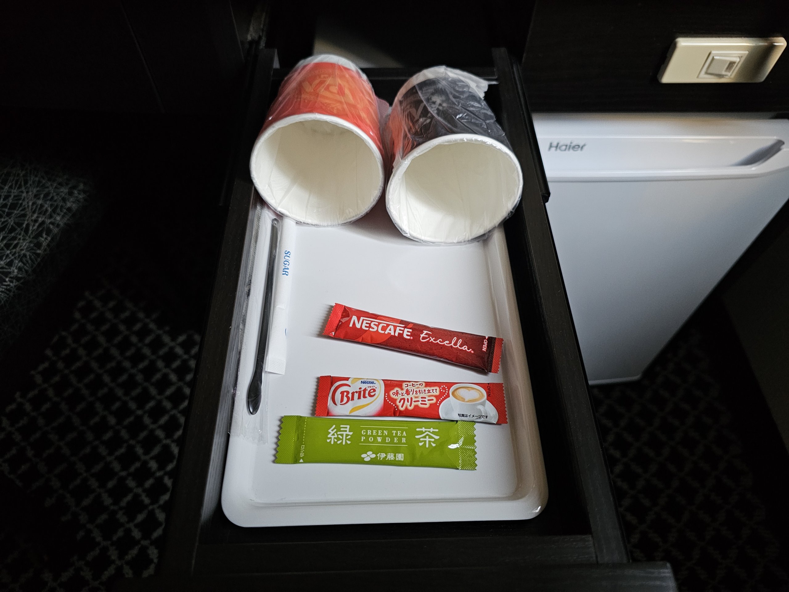 Det finns också en kyld dryckesautomat i receptionen (endast kontanter), men det är mer troligt att du använder Lawson mini-market direkt mittemot hotellet, som är öppen 24/7 och också kan betalas med kort.