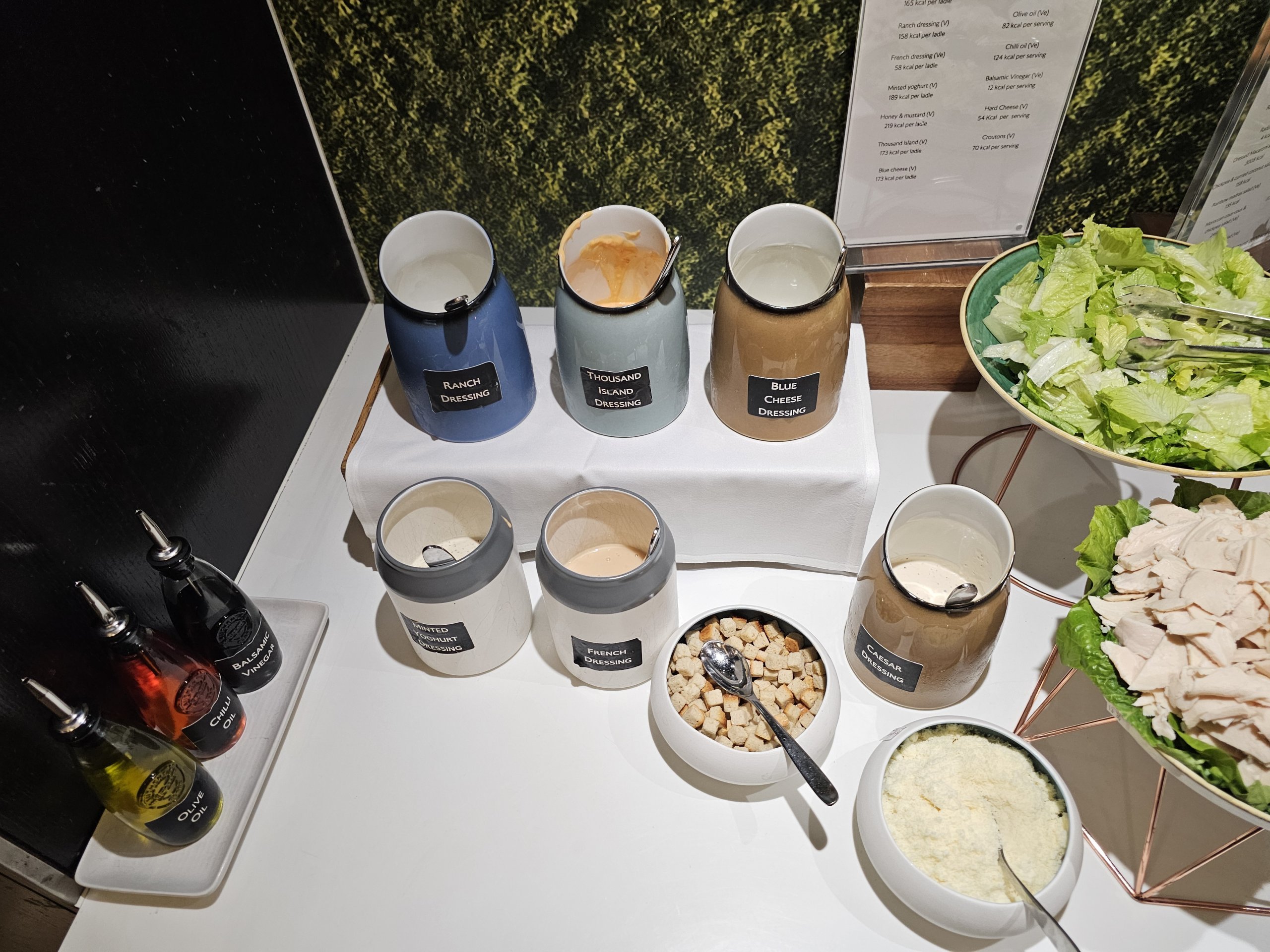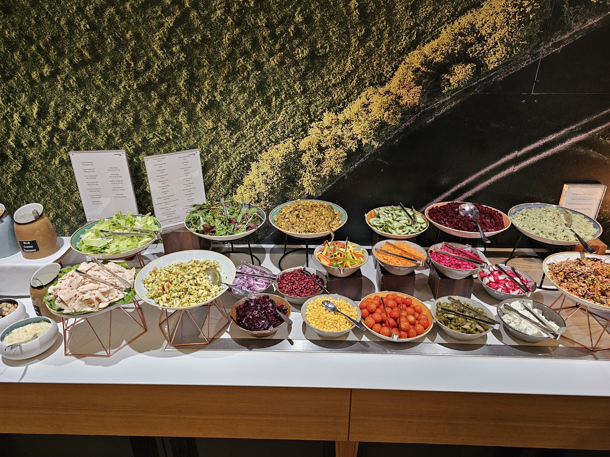 Menyn för kall mat innehåller några grönsaker, en sallad med ett urval av olika dressingar och ett mycket begränsat och svagt urval av bakverk (praktiskt taget bara sött).