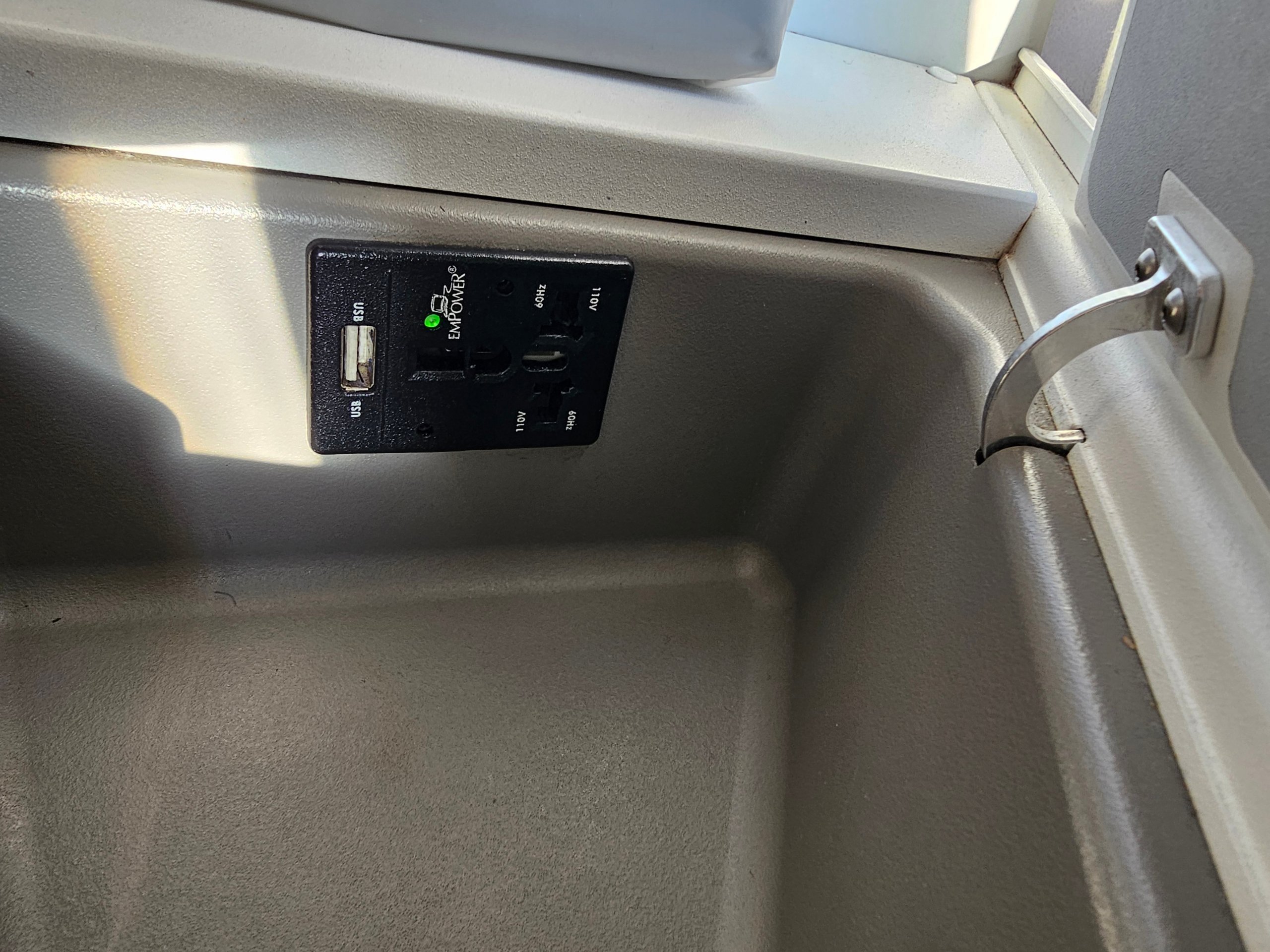 Säteskontrollen är enkel - via den äldre men funktionella pekskärmen till vänster. Det finns också en liten läslampa och ett universellt eluttag med en USB-A-port.