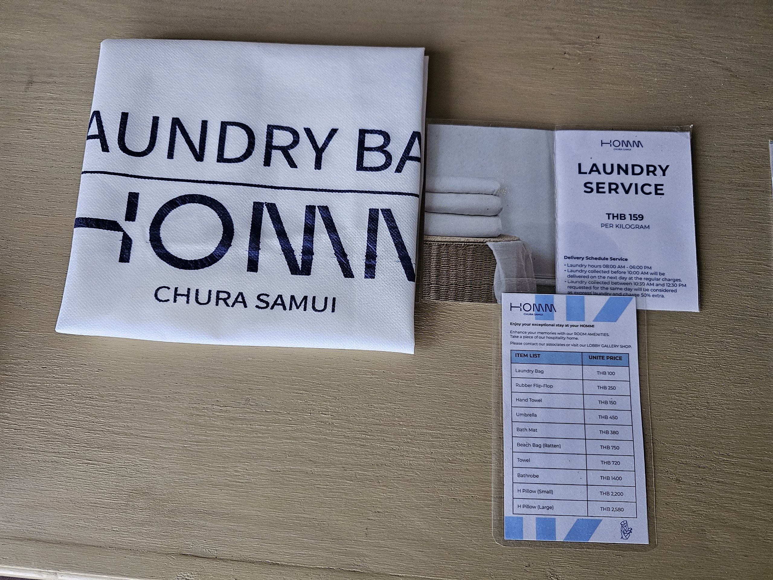 - Tvättservice - att tvätta 1 kg smutstvätt kostar 159 thb (som jämförelse har offentliga tvätterier var som helst på gatan priser från 50 thb för 1 kg och det finns ett stort antal av dem på Koh Samui)