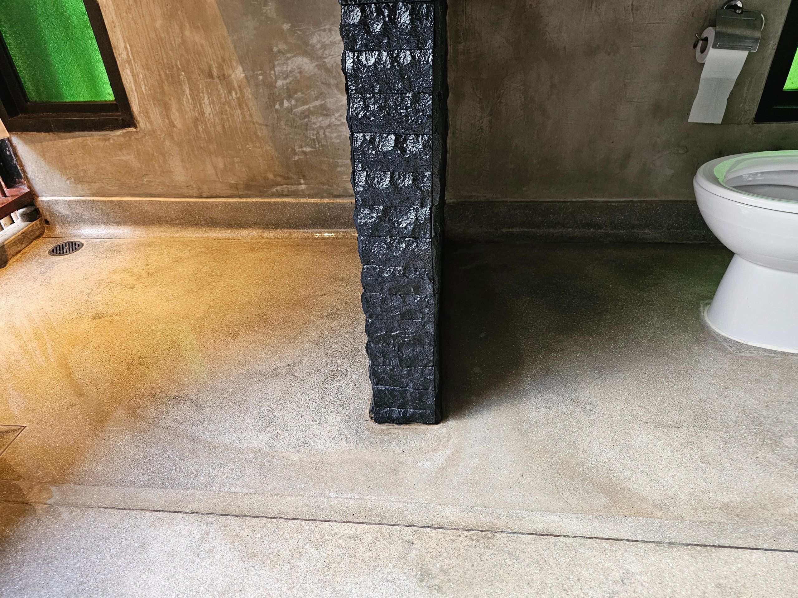 Badrummet är omslutet på fyra sidor men saknar tak, vilket är ett medvetet designdrag.