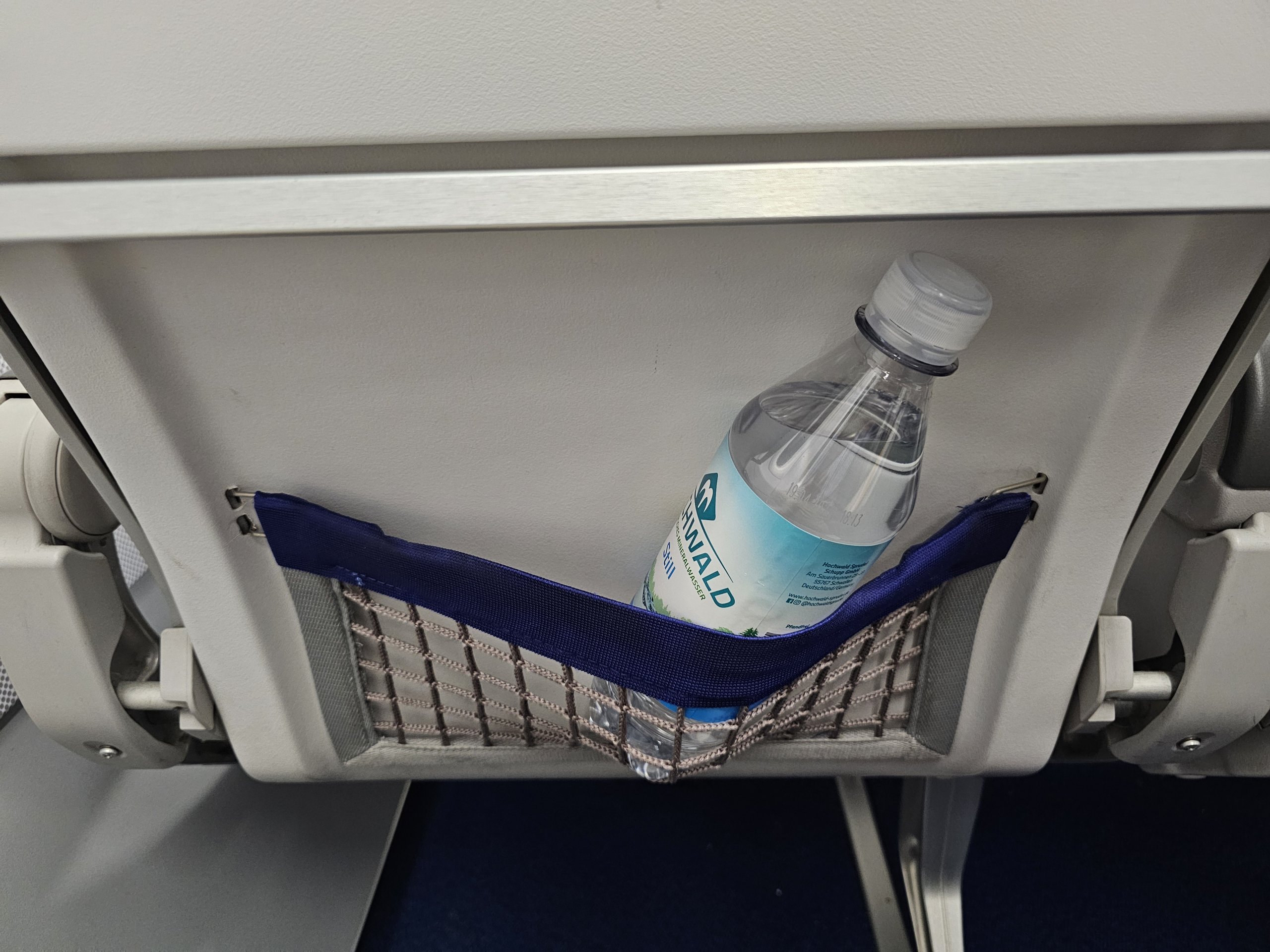 Det finns ingen välkomstdrink före avgång. Den ersätts endast av en 0,5 liters vattenflaska i ett nät vid sätet.