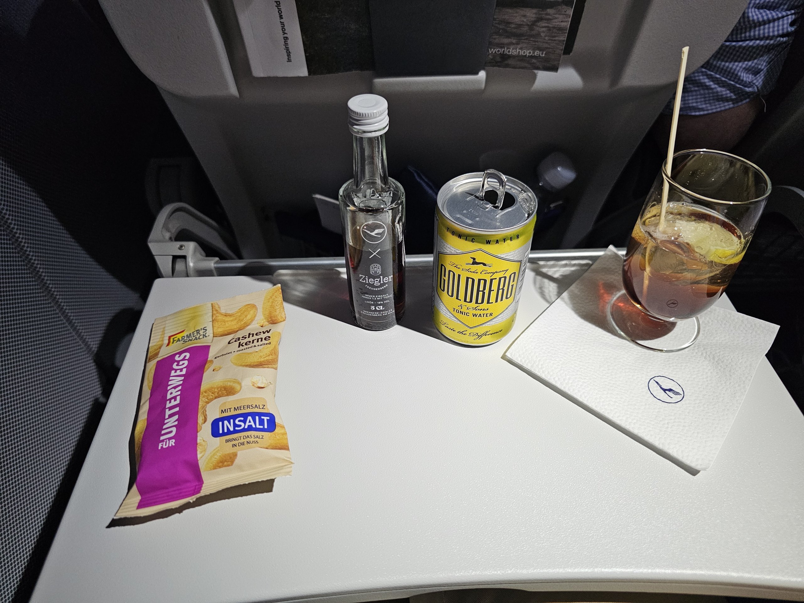 Cirka 20 minuter efter start kommer den första servicen i form av en dryck och en påse kex. Naturligtvis har jag min favoritcocktail med Lufthansas signatur, Avionic.