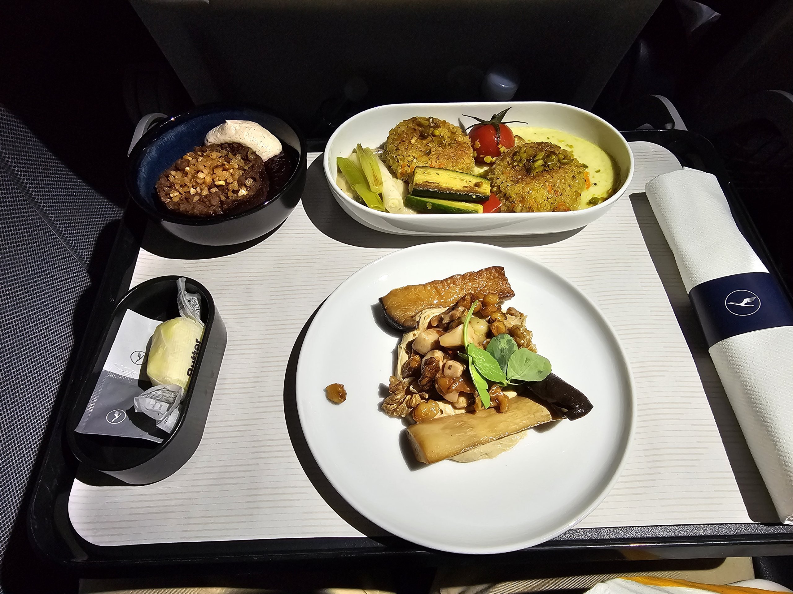 Jag har ätit bättre måltider på planet, quinoan är torkad och med brödsmulor, så måltiden är inte så lätt som jag förväntade mig. Men svampförrätten är fantastisk och plommoncrumblen är också utsökt,