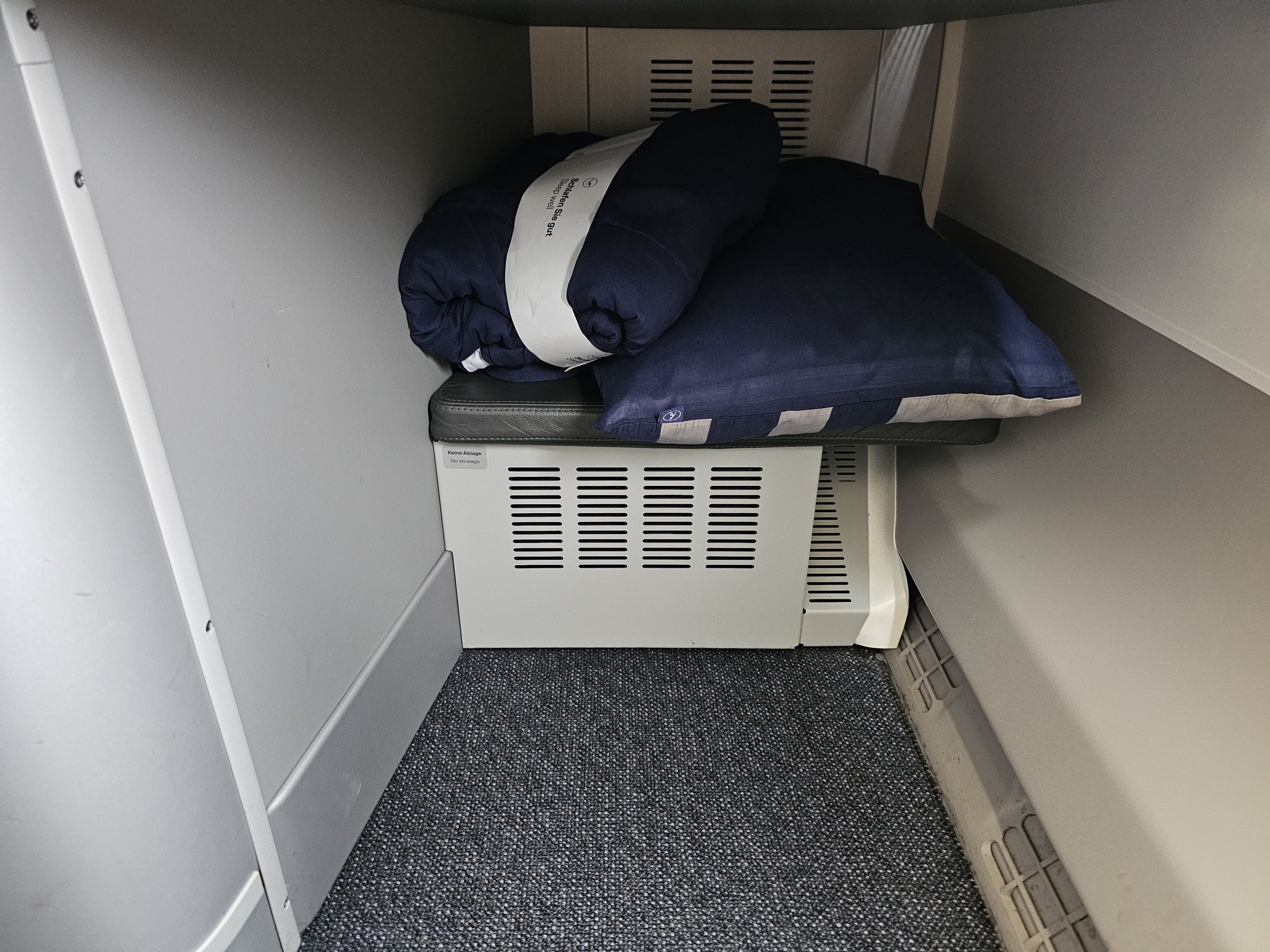 Den saknar sängkläder, men det brukar vara standard endast på nattflygningar.