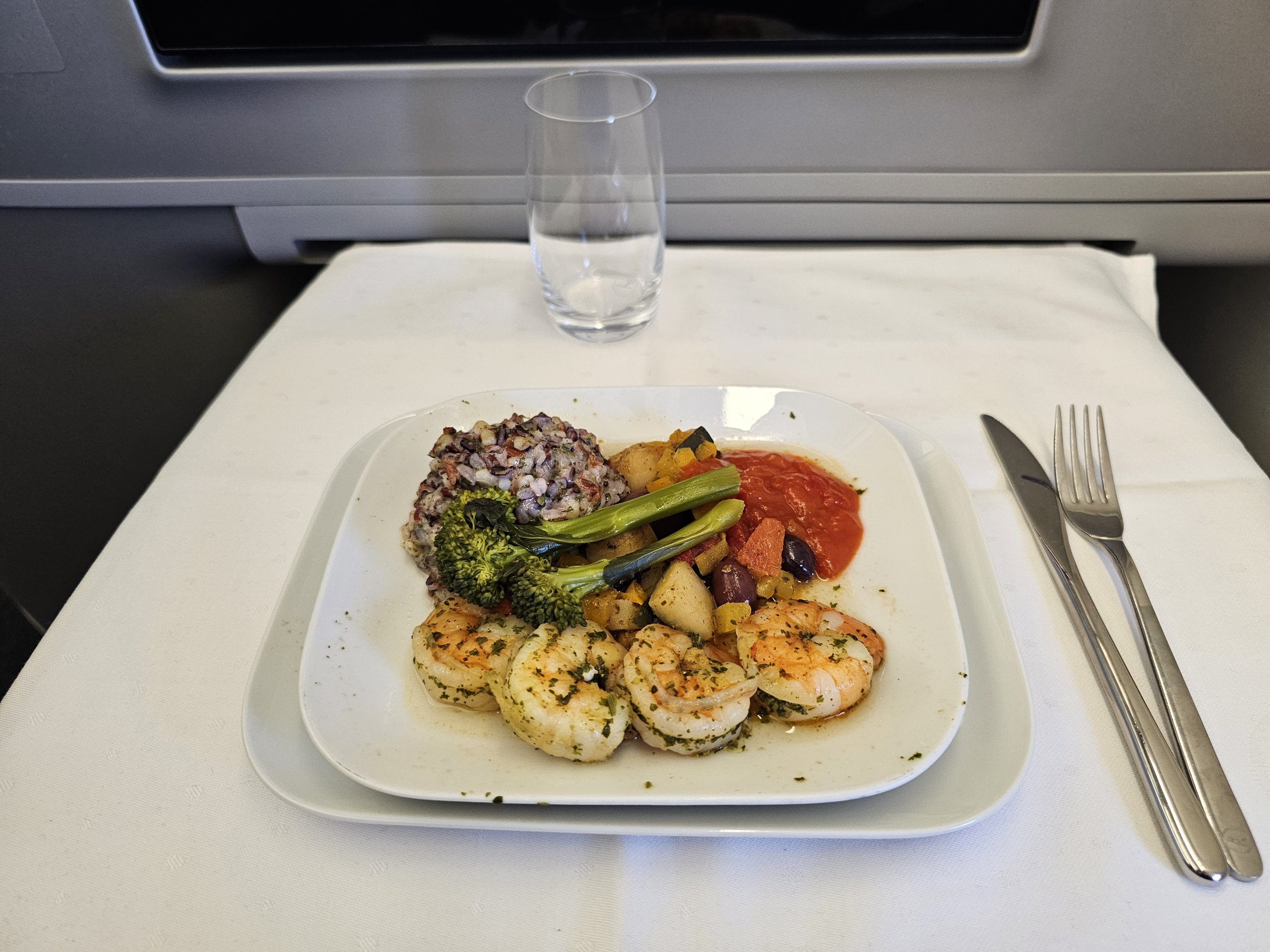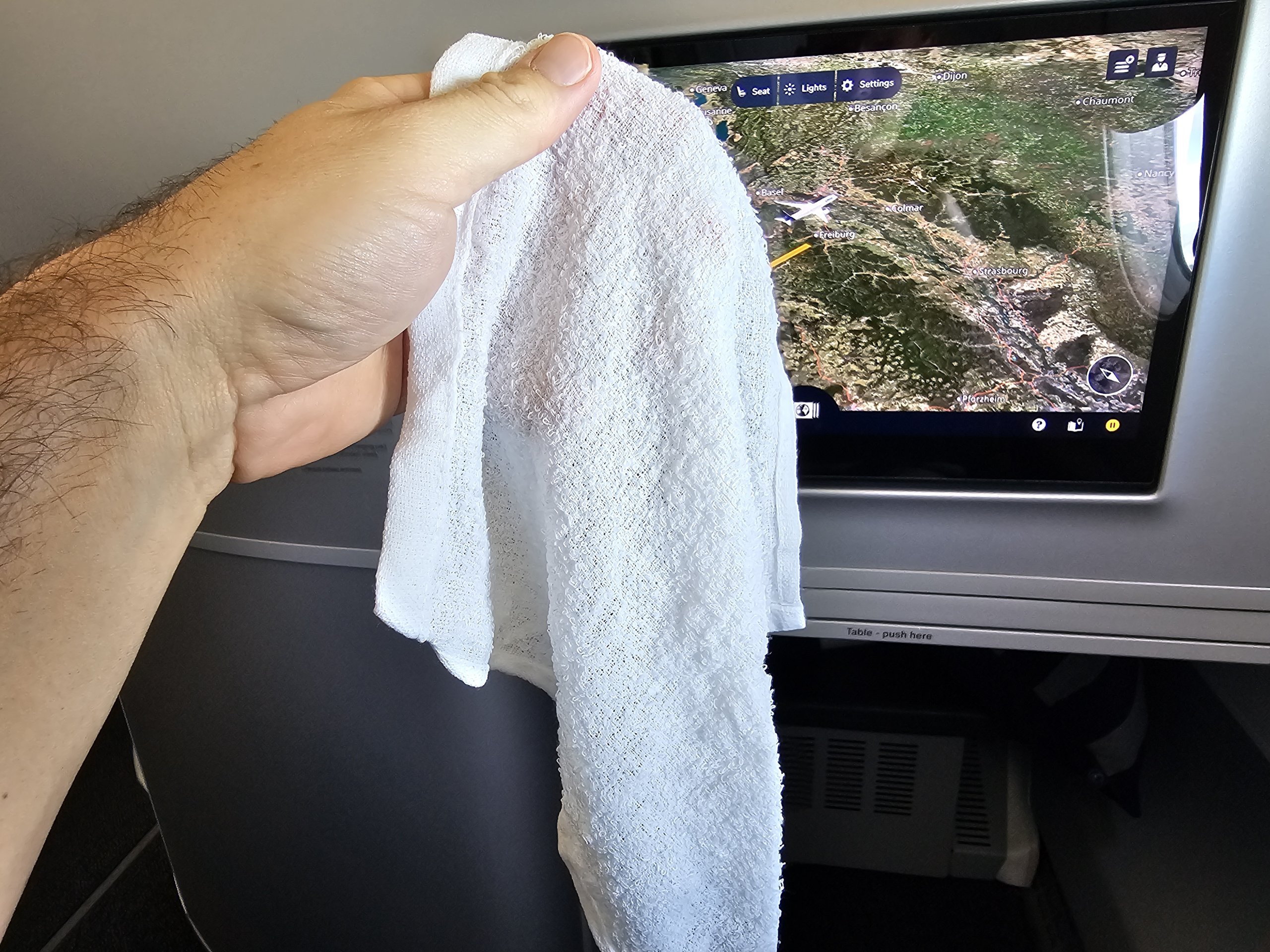 Huvudrätten anländer ungefär en timme efter start. Före måltiden får vi den traditionella varma våta servetten, som delas ut en gång till före landningen.