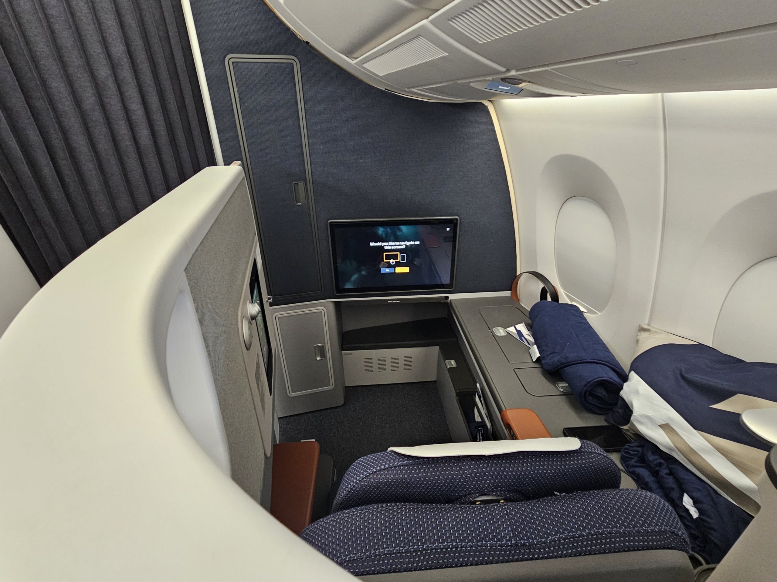 Vi flyger med en Airbus A350-900 som bara är några månader gammal, och business class-kabinen ser ny och modern ut vid första anblicken.