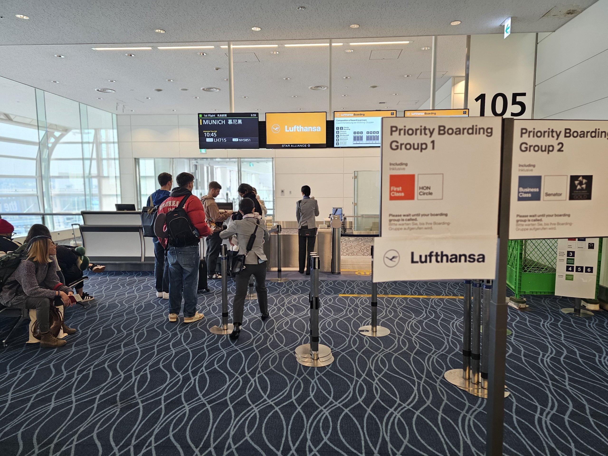 Eftersom jag har två stora resväskor måste jag gå till incheckningsdisken. Tyvärr har Lufthansa inga automatiska diskar på Haneda Airport, så jag måste vänta tills incheckningstiden börjar.