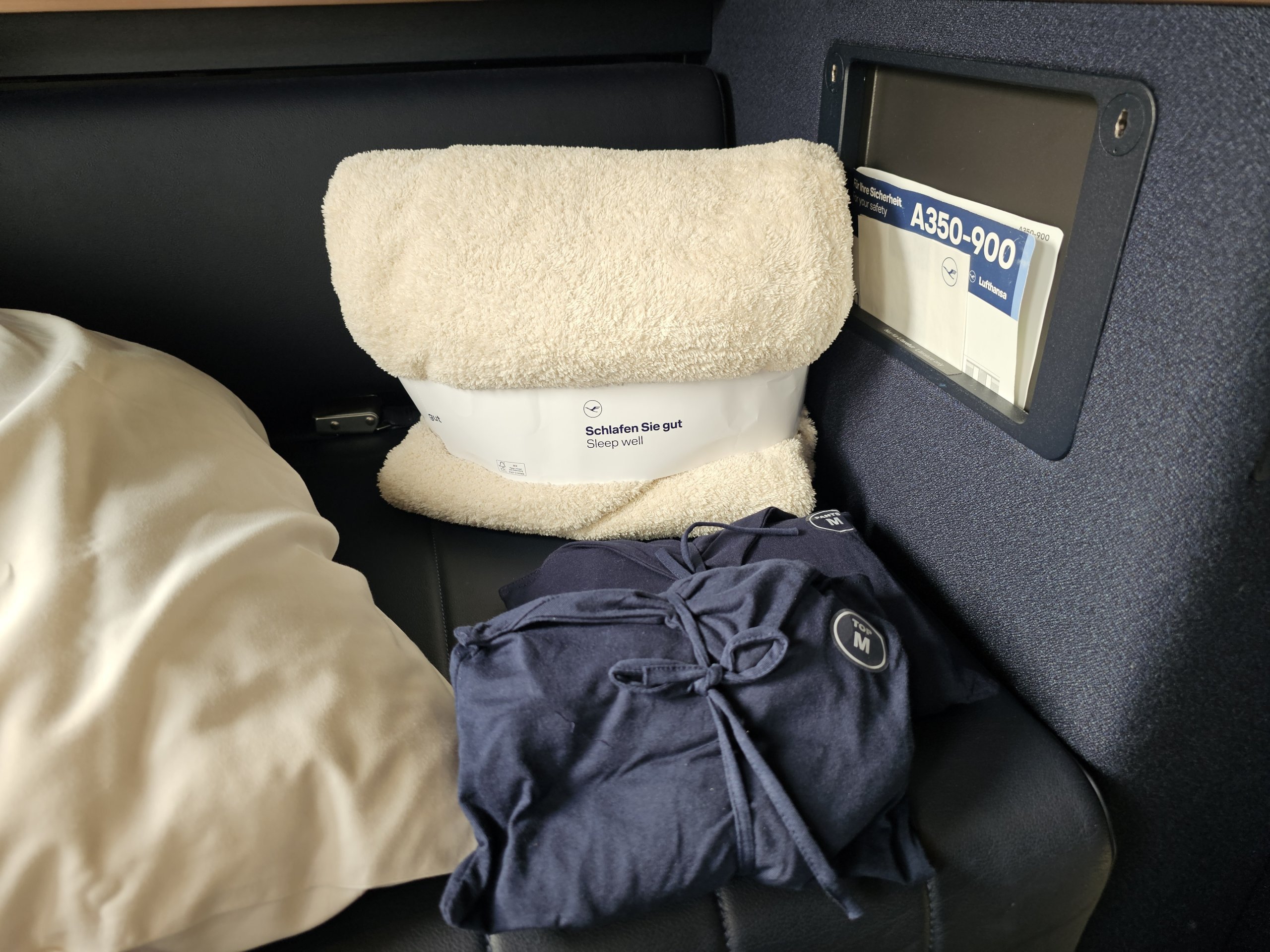 Sätet är utrustat med en extremt bekväm kudde och filt som kan användas när som helst under flygningen. För att sova får du sedan en annan filt och sängkläder från besättningen.