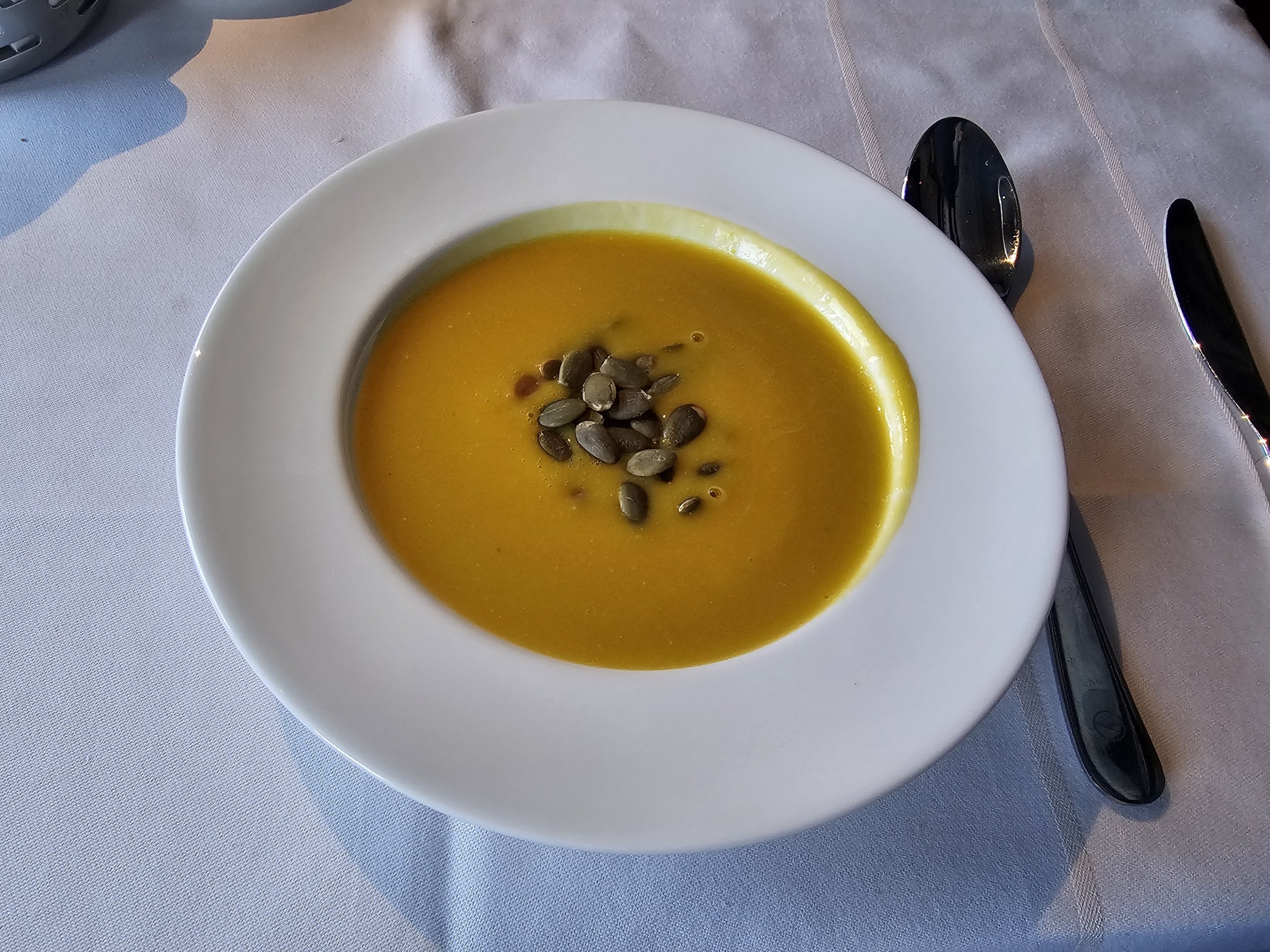 Jag äter en god pumpa- och ingefärssoppa före maten.