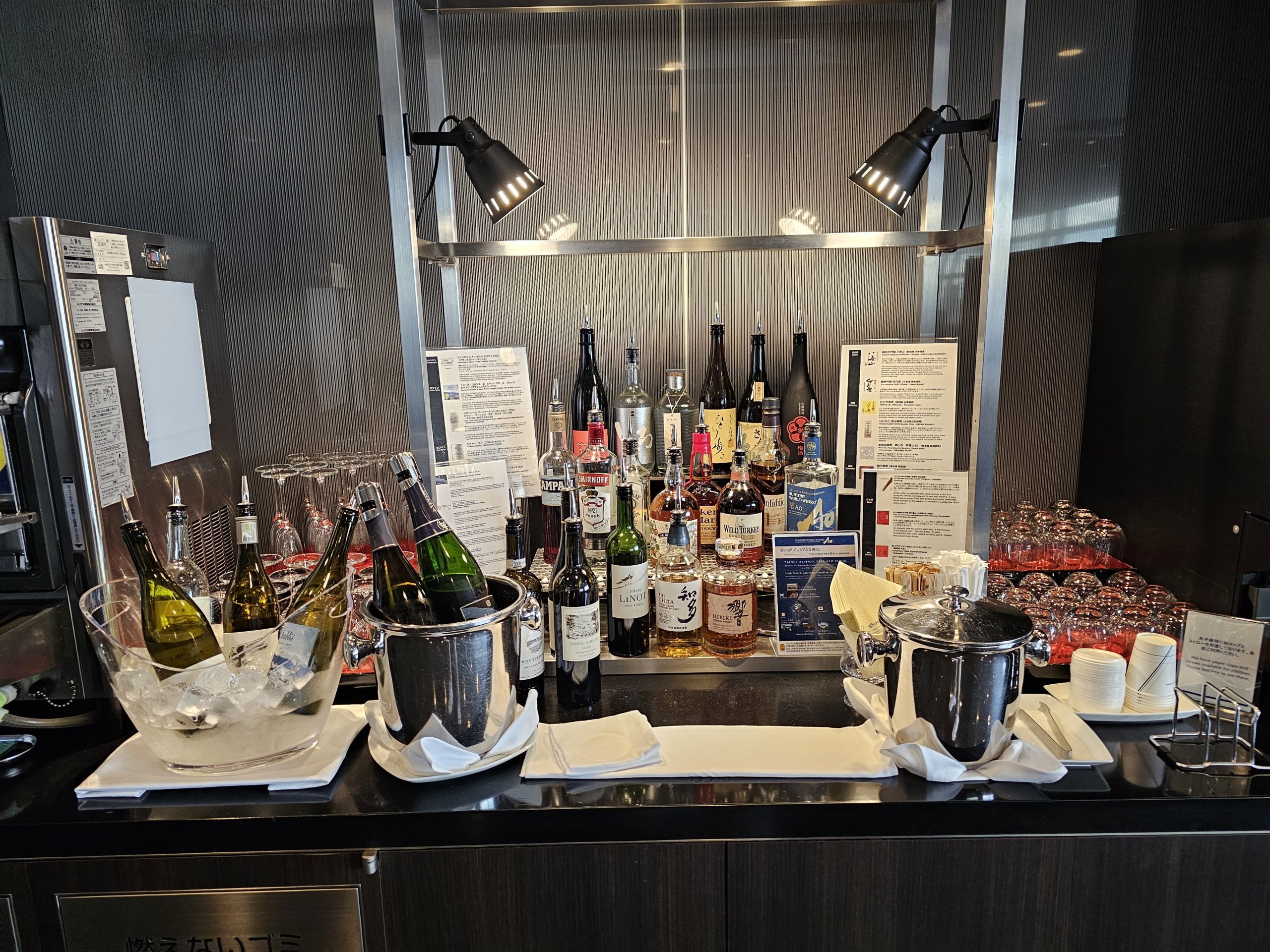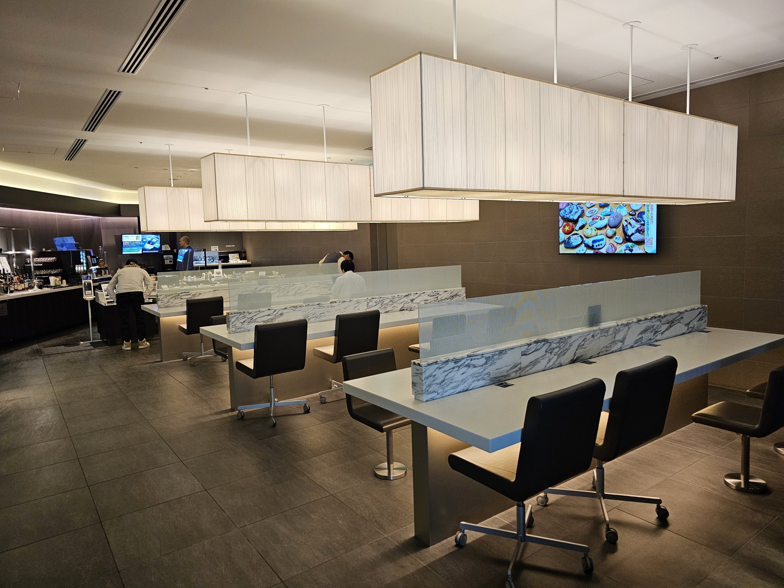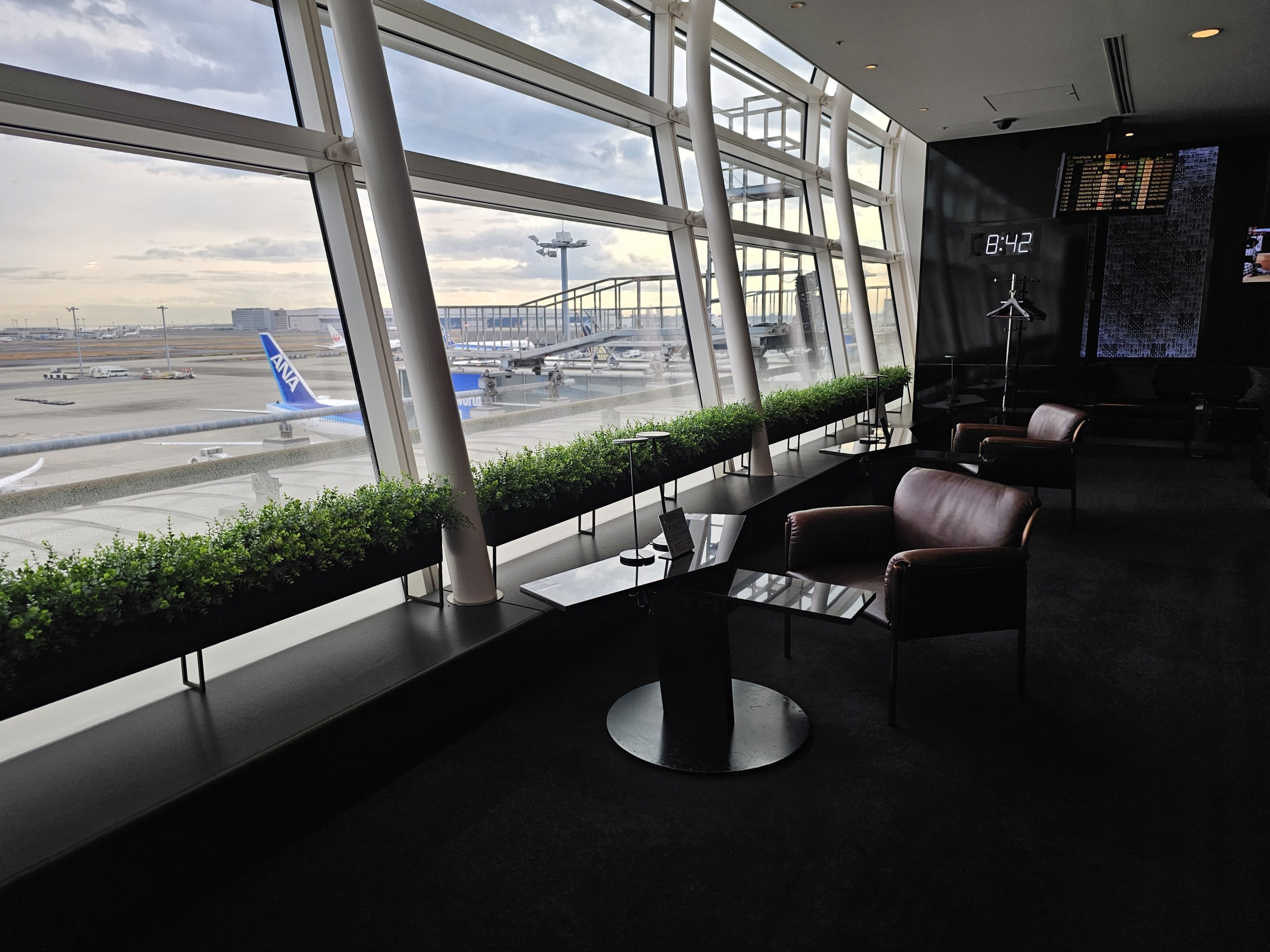 Loungen är mycket rymlig med en fantastisk utsikt över asfalten och gott om bås som efterliknar förstaklassstolarna på ANA Japan Airlines.