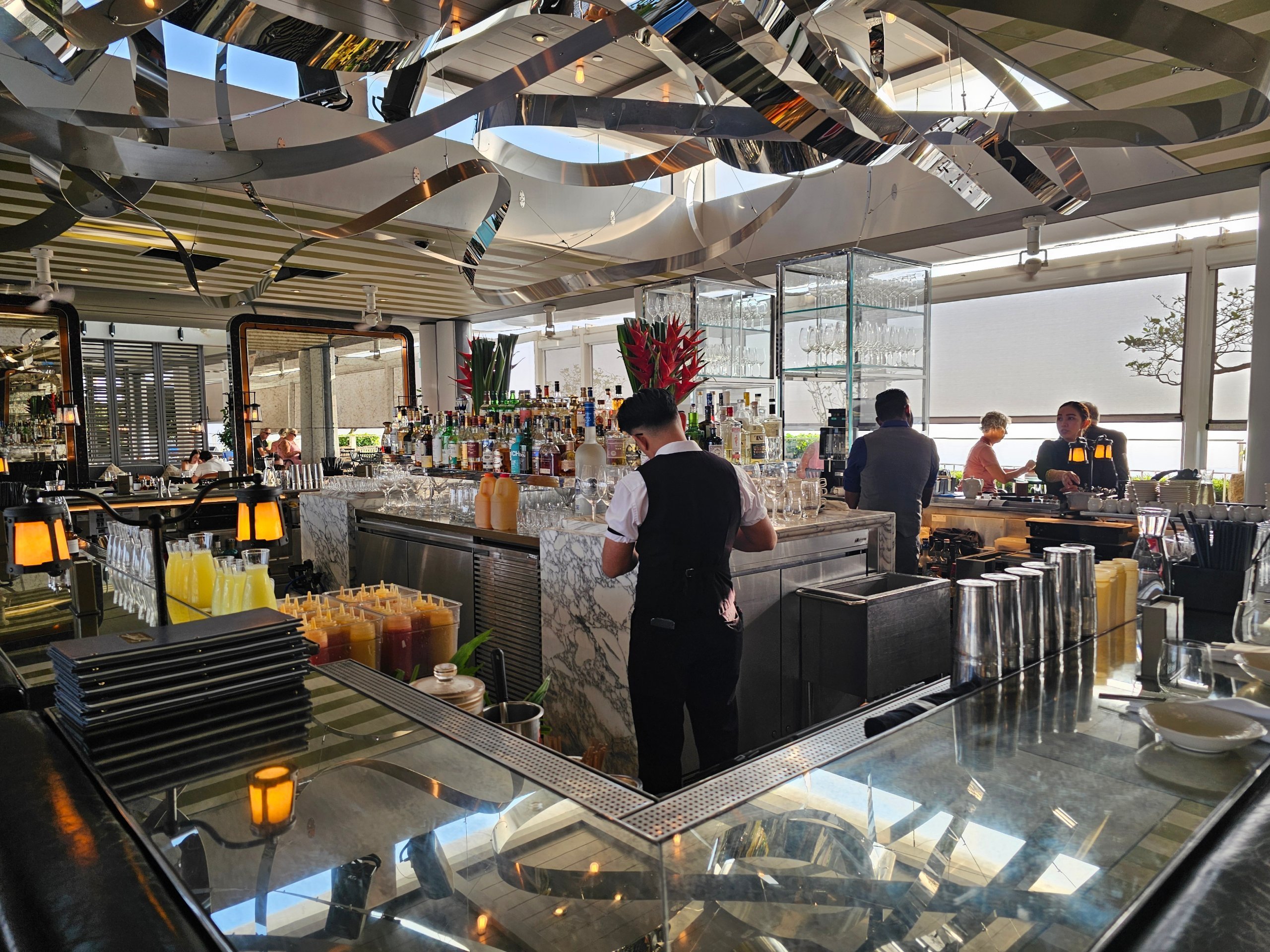 Frukost serveras i Spago Bar precis vid den ikoniska takpoolen.