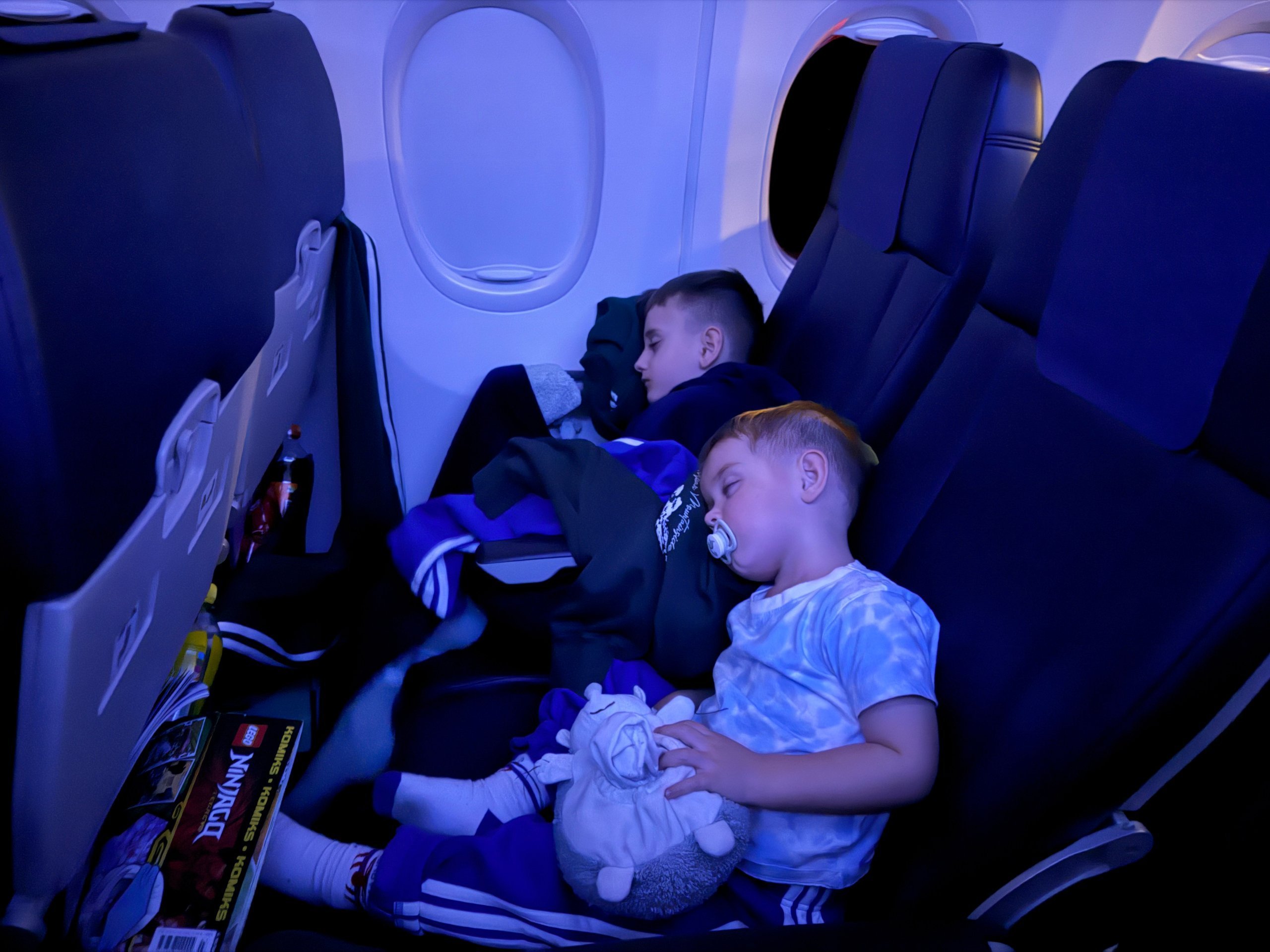 Sömnen gör så småningom att hela flygningen går så mycket snabbare att till och med våra barn når sin destination utan att bli extremt uttråkade.
