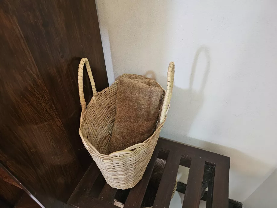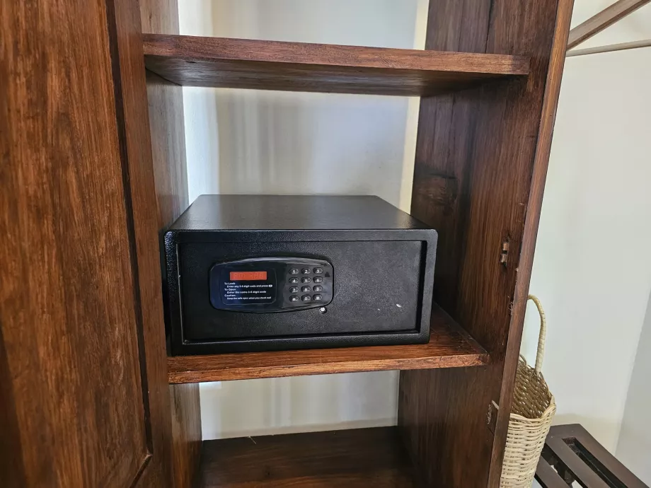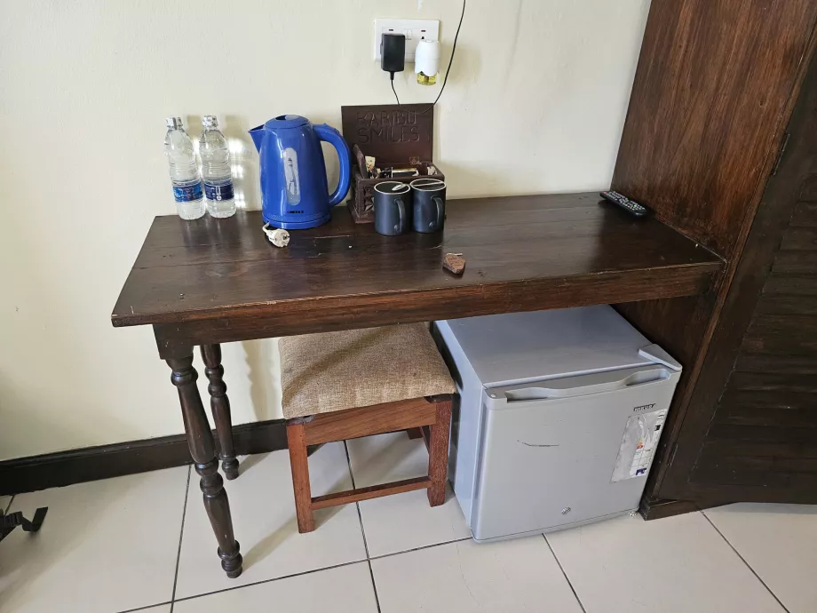 I rummet finns också ett kassaskåp, strandhandduk, vattenkokare, snabbkaffe och te.