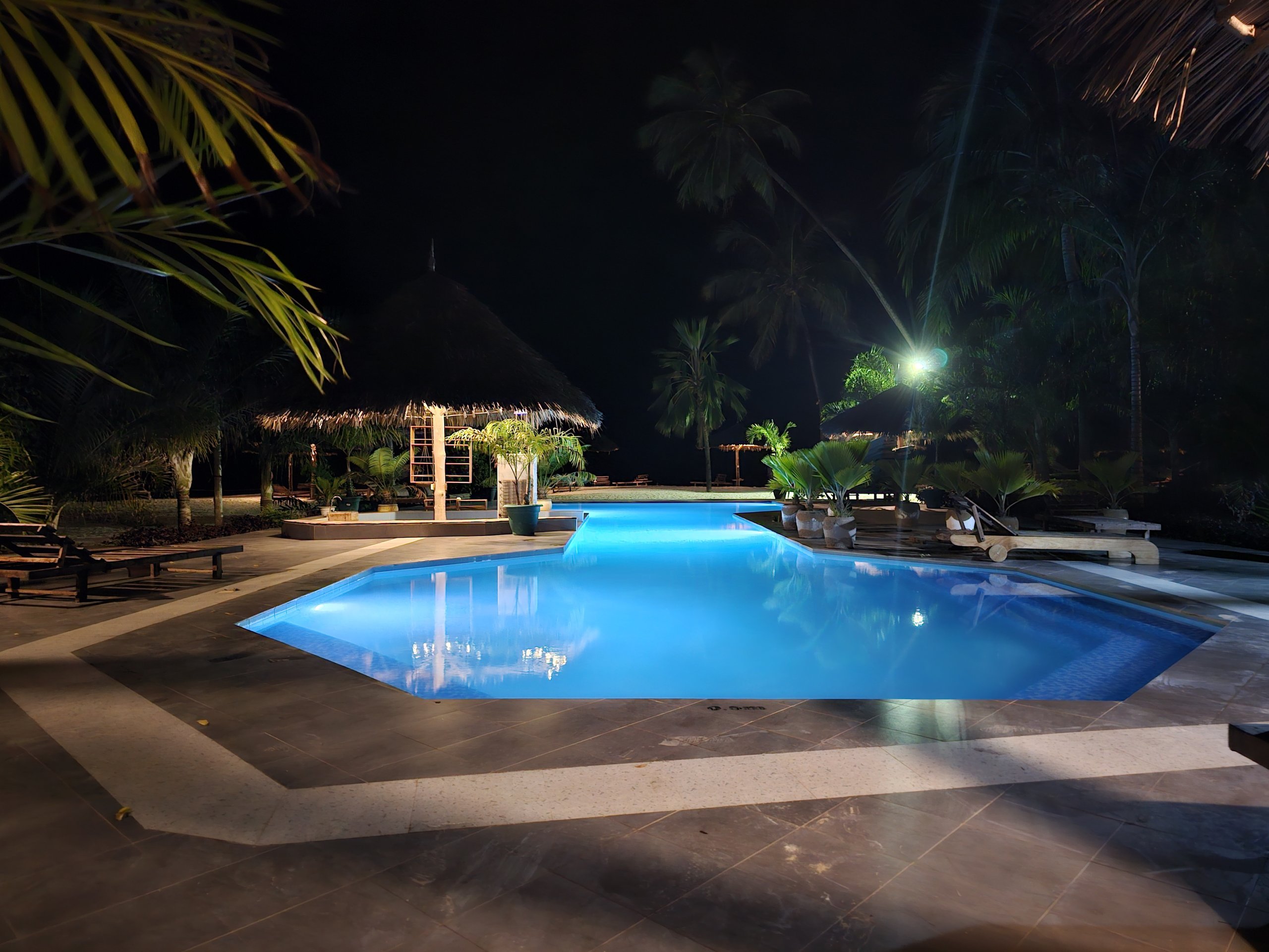 Poolen är tillgänglig dygnet runt och är vackert upplyst på kvällen.