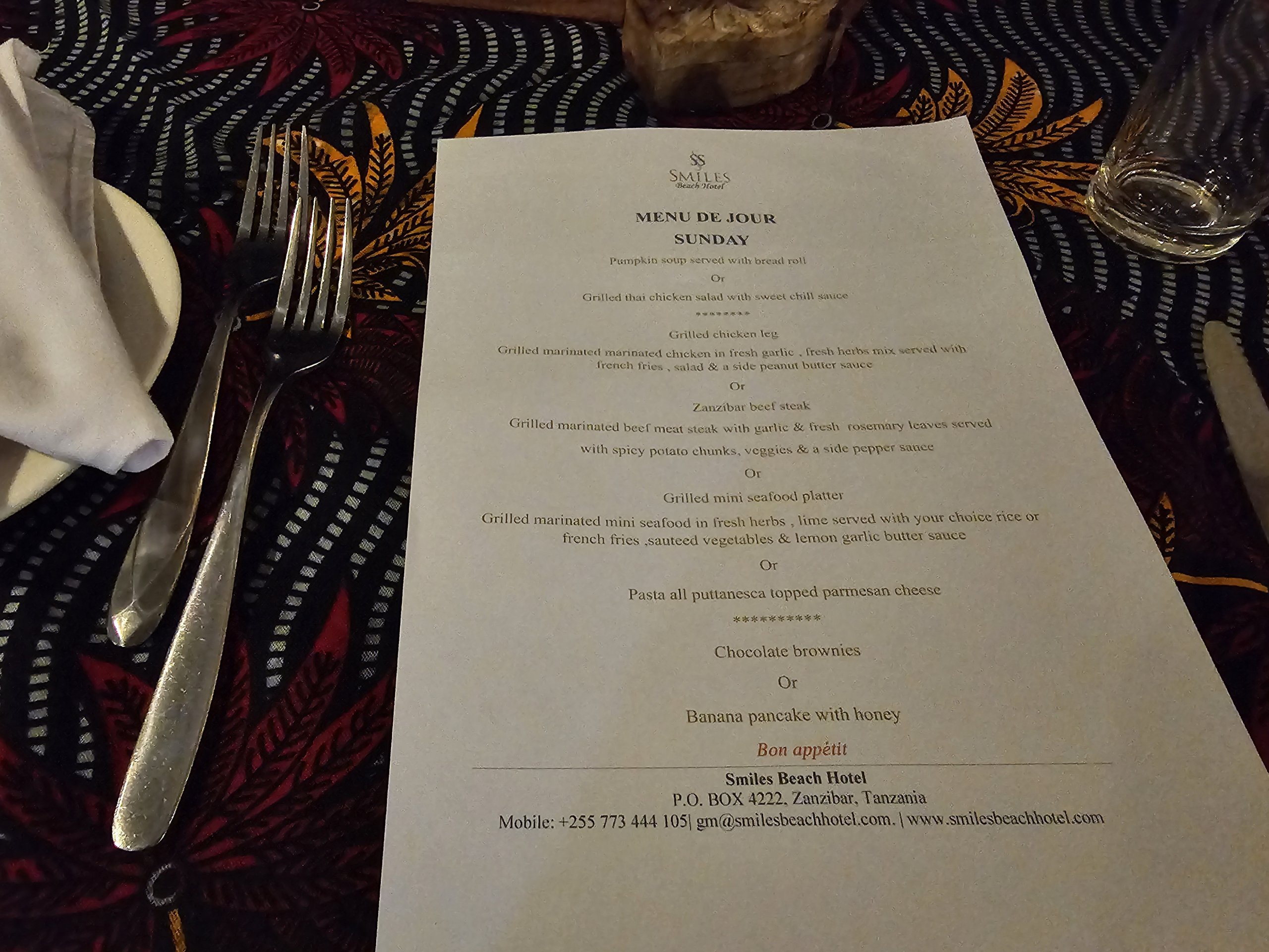 Vid första anblicken är menyn mycket dålig, men jämfört med andra hotell i samma kategori på Zanzibar, till exempel Sea View Lodge i Jambiani, dit jag flyttade från Nungwi, är den faktiskt över genomsnittet.