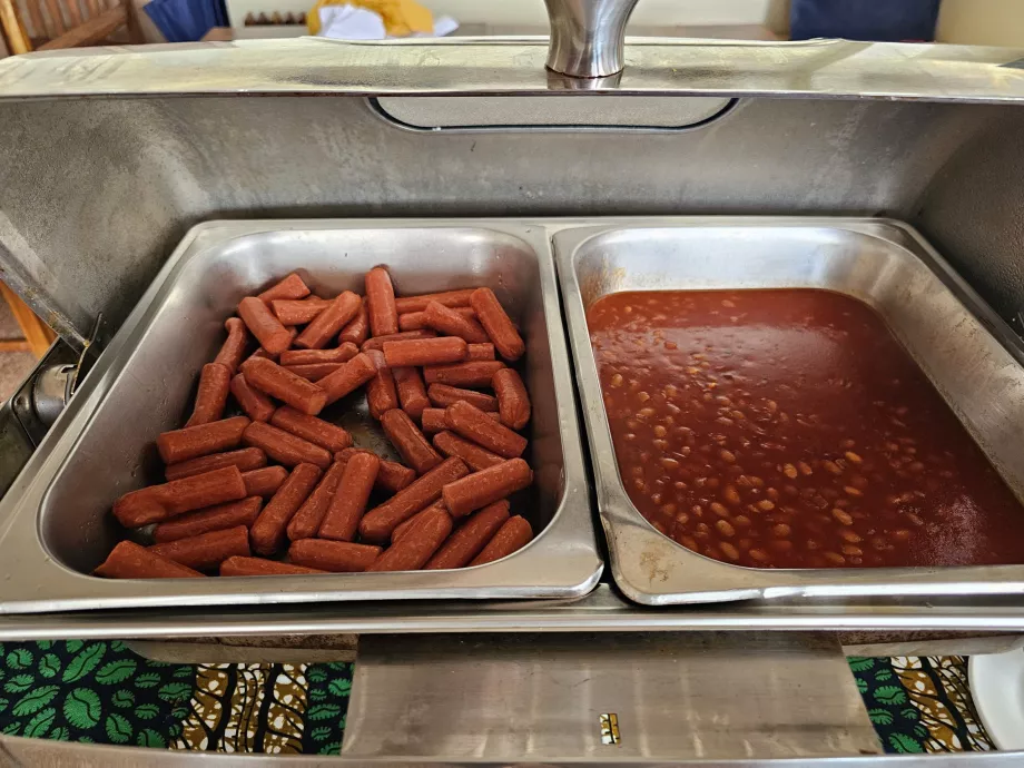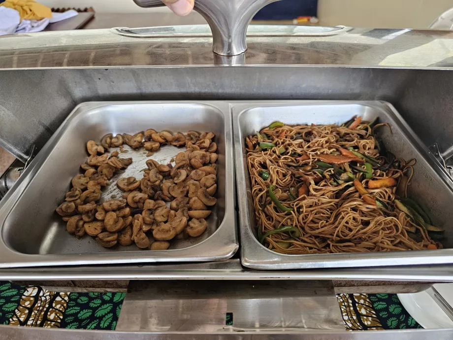 Det finns tre typer av varm mat att välja mellan - mest nudlar eller ris, korv av mycket dålig kvalitet, chapatipannkakor eller andra lokala bakverk, kokta grönsaker, bönor eller svamp.