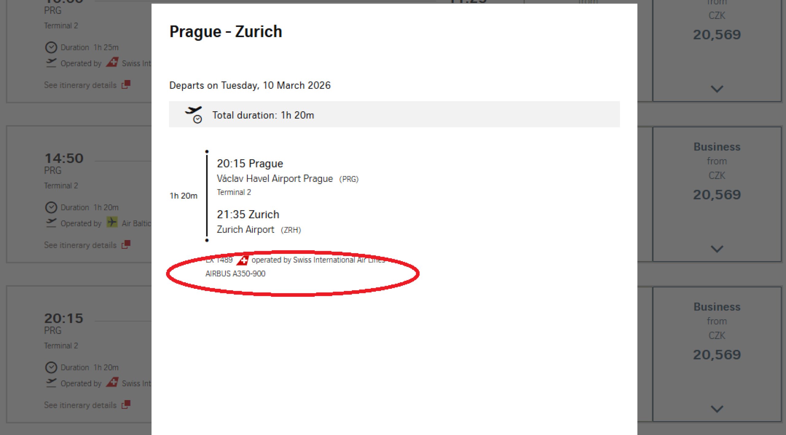 Flygplanstypen visas när du klickar på en specifik flygning på swiss.com: