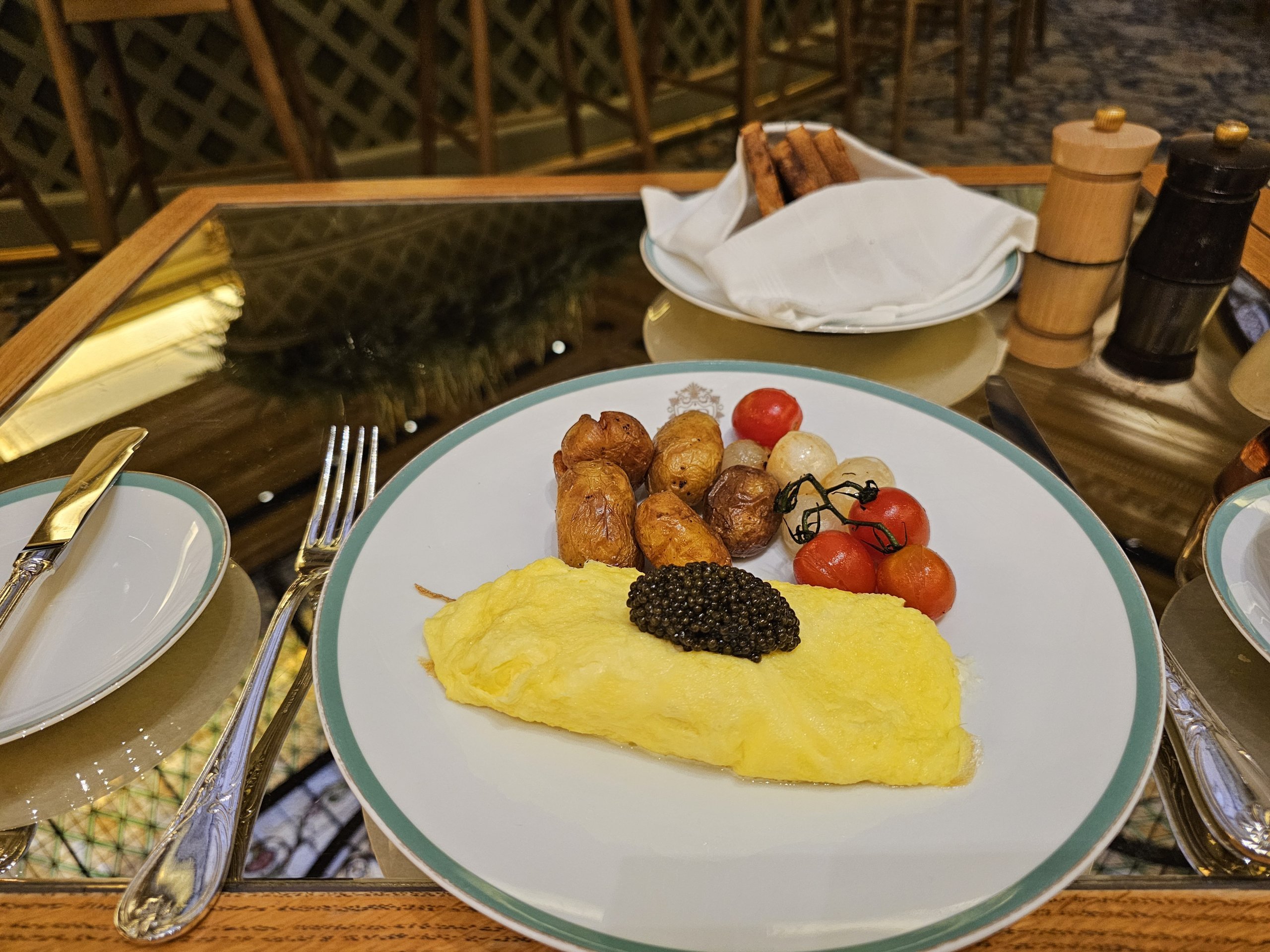 Frukost serveras i både Palm Court och Champagne Bar - man kan beställa samma mat på båda ställena.